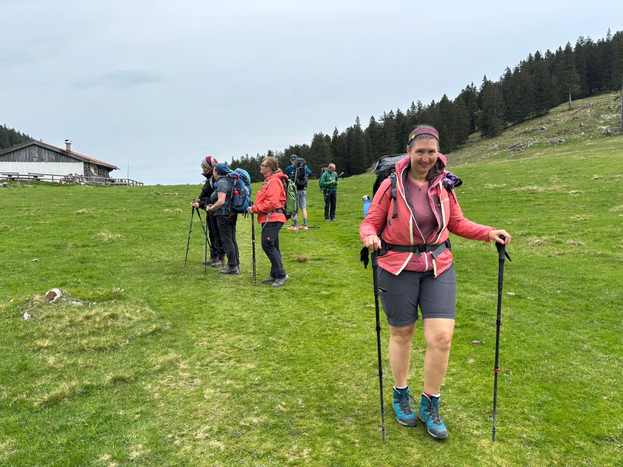 Wie immer nach so langer Zeit, sind wir etwas zu flott losgezogen, aber es heißt ja einlaufen und das haben wir dann schon hinbekommen. Das Wetter war erst noch etwas bedeckt und für unsere erste große Pause mussten wir noch die Jacken anziehen. Der Weg war nicht steil, aber es ging kontinuierlich 900hm nach oben. Als wir an der Hütte (Hochrieshütte 1560m) angekommen sind, hat uns ein kleiner Schauer erst einmal in die Hütte getrieben, aber nach dem Essen wurde das Wetter immer besser und wir konnten auf der tollen Terrasse, einen traumhaften Ausblick genießen. Die einen nur auf der Bank sitzend, die anderen gleich auf der angrenzenden Wiese – es war einfach wunder, wunderschön.