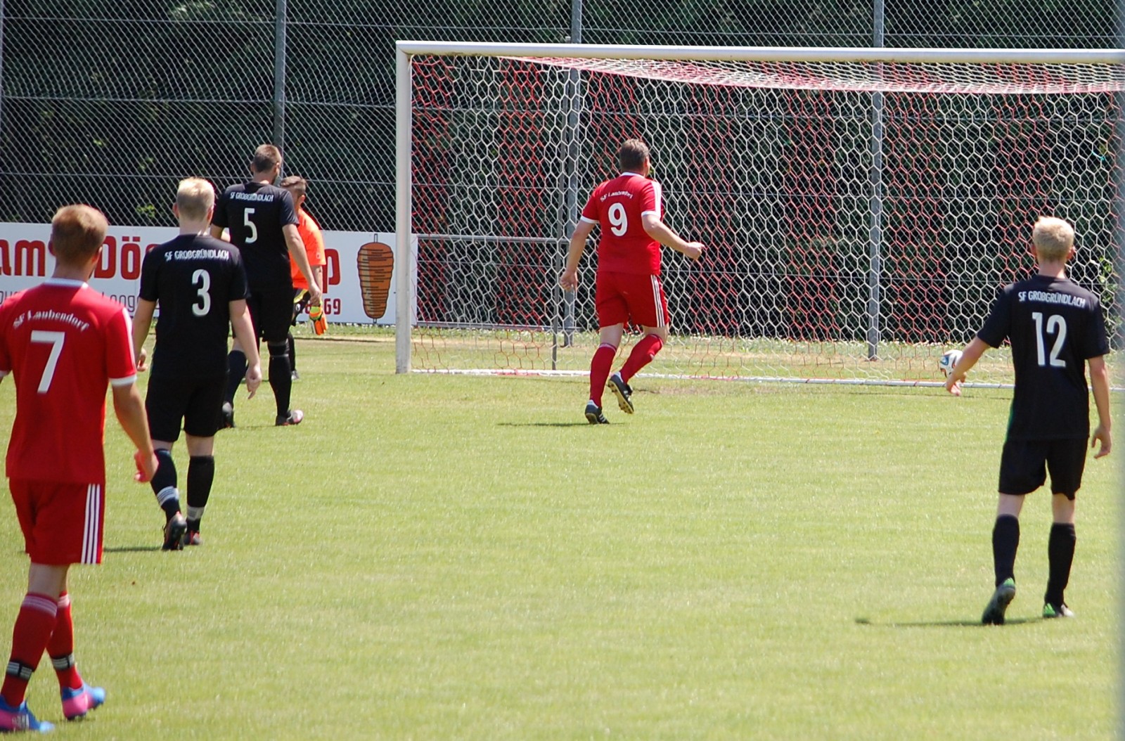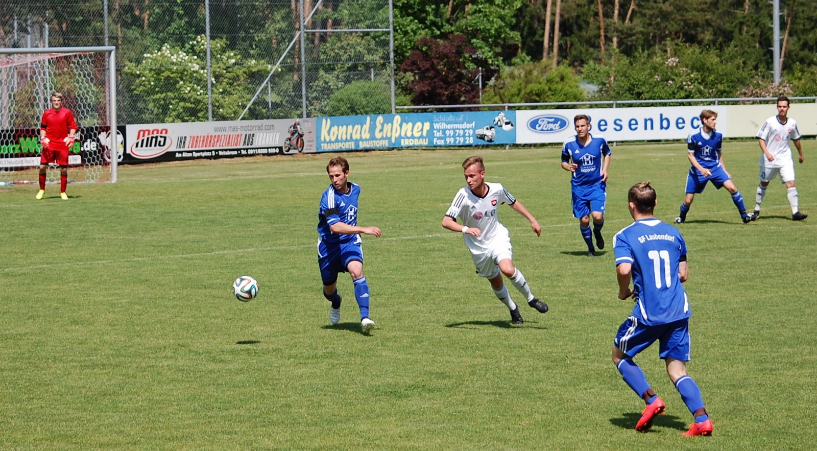 Zu Beginn war der SFL zu weit weg von seinen Gegenspielern und spielte oft überhastet. Die ruhig spielenden Gäste nutzten dies und gingen durch Goldhahn mit 1:0 in Führung. Anschließend versuchte der SFL sich ins Spiel zu kämpfen was aber nicht so gut gelang. Dennoch konnte durch Moritz Loch der Ausgleich erzielt werden. Mit einem weiteren Treffer durch Felix Durlak gingen die Laubendorfer mit einer Führung in die Pause. Nach dem Wiederanpfiff erwischten die Gäste aus Großgründlach wieder den besseren Start. So konnte Mennel völlig frei zum 2:2 einschieben. Im weiteren Spielverlauf fielen keine weiteren Tore mehr, obwohl beide Mannschaften sich bei den hohen Temperaturen durchaus bemühten weitere Tormöglichkeiten zu kreieren.