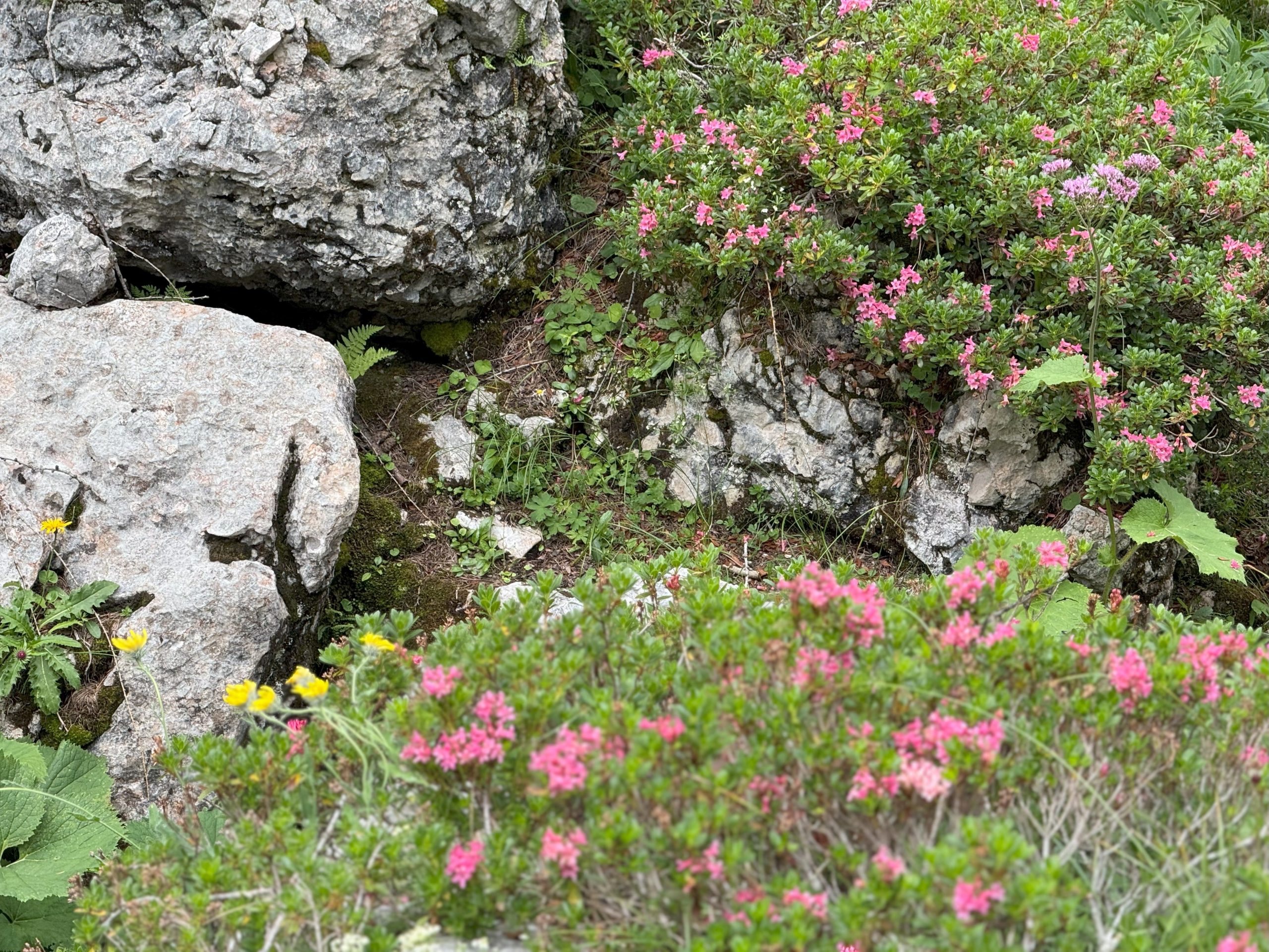 Samstag, ging es dann um 8.30 Uhr los. Unser Ziel das Wagendrischelhorn (2251m). Das Wetter war so, lala. Es zogen immer wieder dunkle Wolken herum, aber im großen und ganzen blieb es trocken. Gegen Mittag waren Gewitter angesagt. Die von Jürgen ausgewählte Route ging Richtung Südwesten vorbei an der alten Traunsteiner Hütte (die man bei der Sektion auch mieten kann – ist also auch noch in gutem Zustand) über die so genannte Roßgasse über Karstgelände Richtung Wagendrischelhorn. Bis kurz vor dem Einstieg ging es über kleine Pfade kontinuierlich nach oben. Dann kamen die Spalten, die den Weg nicht wirklich angenehm gestalteten. Dazu kam noch das Wetter, um uns herum waren dann nur noch dunkle Wolken und wir entschieden uns dann unterhalb des Einstiegs nicht den Gipfel zu machen, sondern lieber etwas weiter unten eine Pause zu machen um dann den restlichen Weg, hoffentlich noch ohne Regen zubegehen. Nach der Pause, alle ausgeruht, ging es dann über den Unteren und Oberen Plattenkopf bis zur Böselsteigscharte und von dort auf den Böselsteig zurück zur Traunsteiner Hütte. Das letzte Stück dieses Weges, war einmalig. Die meiste Zeit des Tages sind wir immer mehr oder weniger im Fels oder max. in den Latschen unterwegs gewesen und dann eröffnete es sich uns ein kleinen verwunschenes Tal, mit schönen Bäumen, grünen Wiesen, tollen Blumen – es war wie im Märchenwald. Super schön.