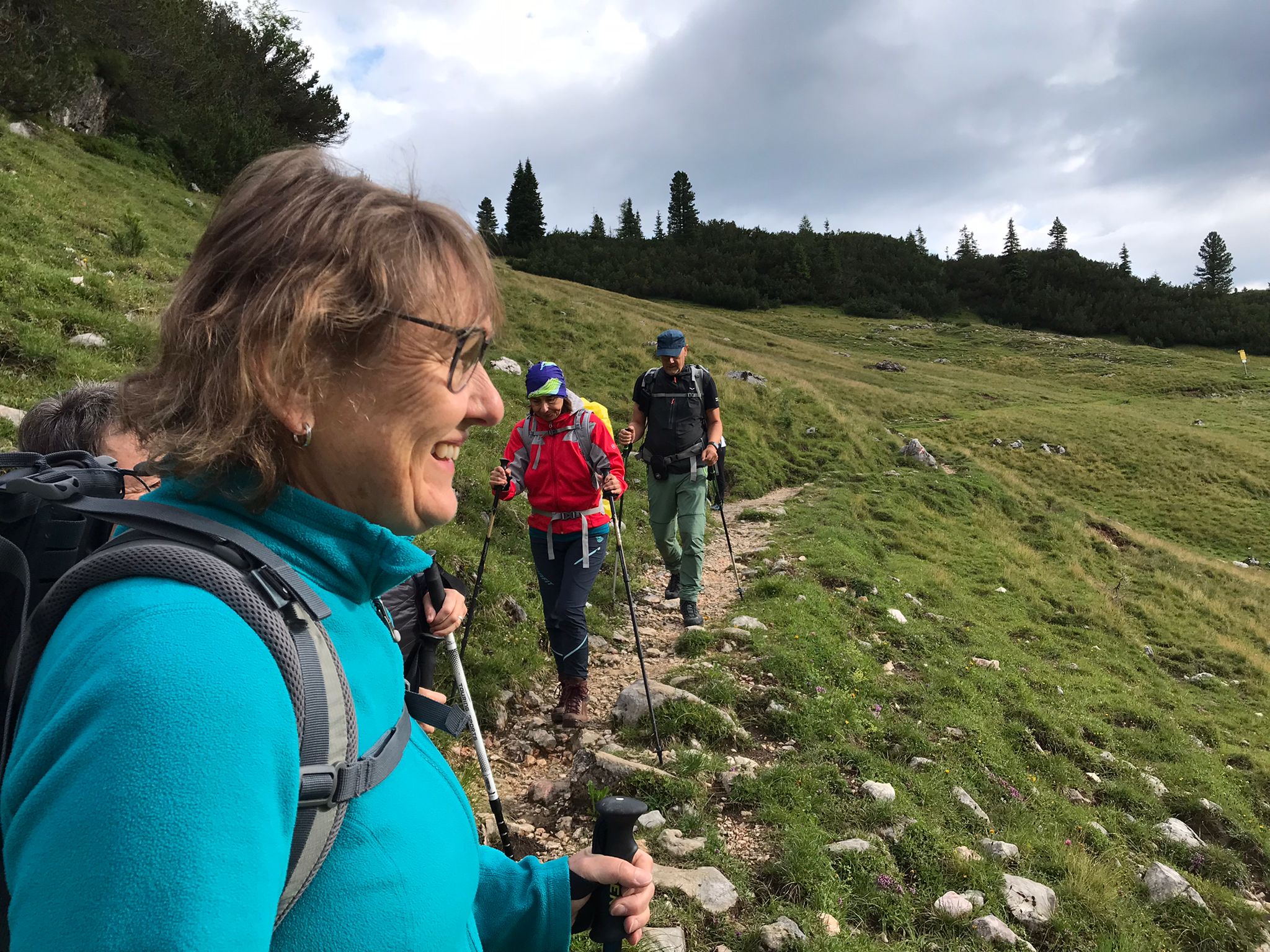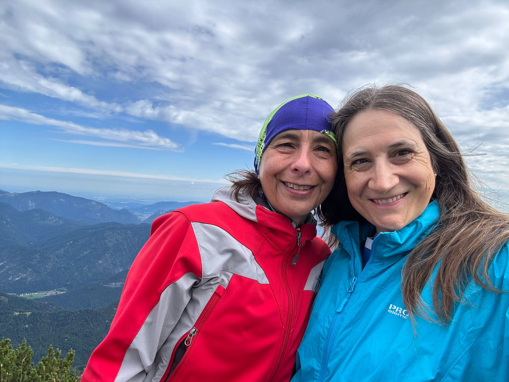 Sonntag, haben wir natürlich die Sachen gepackt. Einen Teil auf der Hütte deponiert, weil das Ziel des Tages war der Gipfel des Weitschartenkopf (1995m). Ca. 400 Höhenmeter Aufstieg und dann ein grandioser Blick Richtung Chiemsee auf der einen Seite und auf der andere in die Bayersichen Berge (z.B. Watzmann) aber noch viel weiter bis nach Österreich konnte man blicken – ein Traum. Auch hier hat uns wieder ein kurzer Schauer, die Ponchos anlegen lassen, aber danach blieb alles trocken. Nach einer Rast auf der Hütte, sind wir dann abgestiegen. Insgesamt 1.400 Höhenmeter. Und das hat sich echt gezogen, erst unglaublich viele Stufen, immer Steil nach unten, die Füße dankten es, als mal für 5 Minuten ein gerades Stück kam und dann ging es wieder steil hinab und hinab. Endlich am Forstweg angekommen, war das dann bei 27 Grad im Schatten auch nicht unbedingt ein Zuckerschlecken, wir kämpften uns tapfer bis zum Parkplatz und freuten uns über eine Brotzeit, ein kühles Getränk und machten entsprechen ausgiebig Pause. Frisch gestärkt und umgezogen, ging es dann Richtung Heimat. Ein super interessantes Wochenende mit einer tollen Tour ging zu Ende.