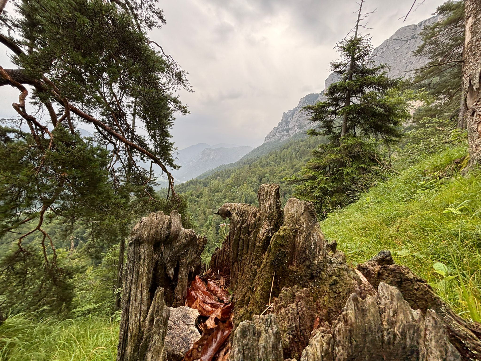 Erst kurz unterhalb des Schrecksattels (1620m) konnten wir, nachdem der Regen aufgehört hat, Pause machen. Dann ging es über den Sattel, am Truppenübungsplatz der Bundeswehr entlang zur „Neuen Traunsteiner Hütte“ (1674m).