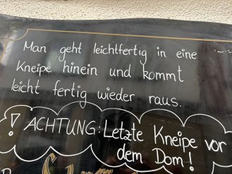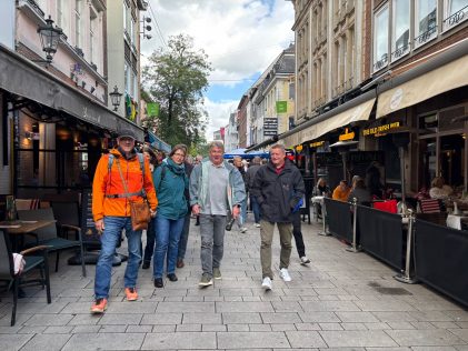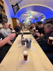 Wieder an Land ging es mit der ganzen Truppe ins „Uerige“ einer der Traditons-Alt-Brauereien in Düsseldorf. Vor dem Essen wurden wir in zwei Gruppen eingeteilt und die Führung durch die altehrwürdige Brauerei konnte beginnen. Allerdings sind eher die Mauern, denn die Technik der Brauerei wird gerade auf den Kopf gestellt und ist topmodern. Für uns Franken gar nicht so vorstellbar, aber das Altbier ist wohl in den USA und auf der ganzen Welt sehr beliebt und die Brauerei exportiert das dann Containerweise nach Übersee. Wieder zurück, wurde dann das angesprochenen Altbier zusammen mit dem Abendessen konsumiert. Im Anschluss ging es dann wieder in kleinen Gruppen entweder in die Altstadt oder Richtung Hotel. Ein Halt bei an einem Straßenstand musste dann aber schon noch sein. Wer von Euch kennt ihn – den „Killepitsch“? Wir haben natürlich probiert – da es aber auch hier eine historische Geschichte gibt, bin ich gleich ins Fettnäpfchen getreten, als ich das Stamperl (mit Fortuna Düsseldorf Logo darauf) in einem weggekippt habe. Eine Dame hat mich dann zurechtgewiesen, dass man „Killepitsch“ genießen muss, weil wohl im Zweiten Weltkrieg in den Bunkern in Düsseldorf der Likör rationiert wurde und man ihn immer mit dem Bewusstsein getrunken hat, dass es vielleicht das letzte Mal sein könnte….