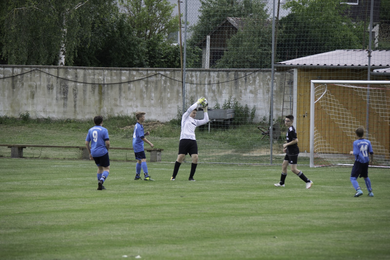 Nach der Pause hieß es dann Ruhe bewahren, den Ball laufen lassen und sich Chancen erarbeiten. Wie in den Spielen zuvor dauerte es allerdings bis wir wieder ins Spiel zurück fanden und man merkte der Truppe an, dass es sehr nervös war und die Infos, dass im Parallelspiel die SG Losaurach/Markt-Erlbach schon 11:0 führte machte alles nicht unbedingt leichter. Aber zurück zu unserem Spiel. Ein Foul kurz vor unserem 16er führte zu einem Freistoß der direkt von der JFG Aischgrund 2 verwandelt wurde. Benni hatte keine Chance, der Ball ging rechts oben in den Winkel – unhaltbar.  Dieses Tor verunsicherte unsere Truppe leider noch mehr und wir kamen gegen die nun komplett tief stehenden und auf Konter wartenden Gegner überhaupt nicht mehr zurecht. Die Zuspiele nach vorne waren entweder zu kurz oder unser Mittelfeld bewegt sich viel zu träge und kam nicht entgegen – so dass wir so gut wie keine Entlastung hinbekommen haben. Es gab noch ein paar Gelegenheiten, die leider aber nicht zwingend waren. Somit zitterten wir uns Richtung Schlusspfiff. Nach über 5 Minuten Nachspielzeit war es dann doch noch geschafft – 3:2 Auswärtssieg!