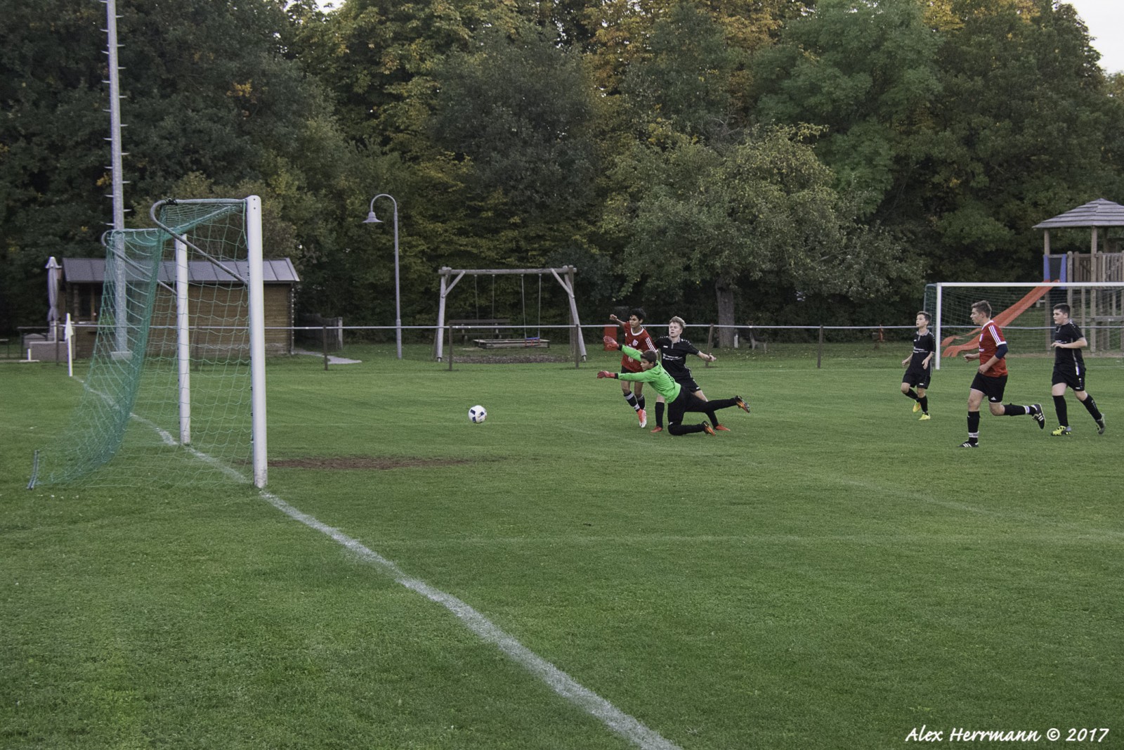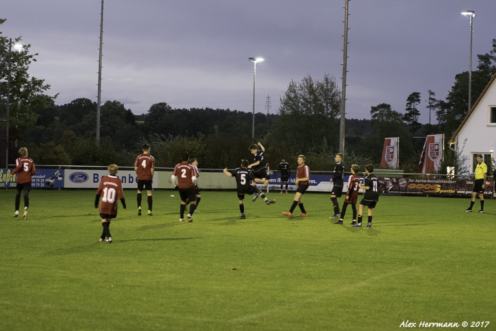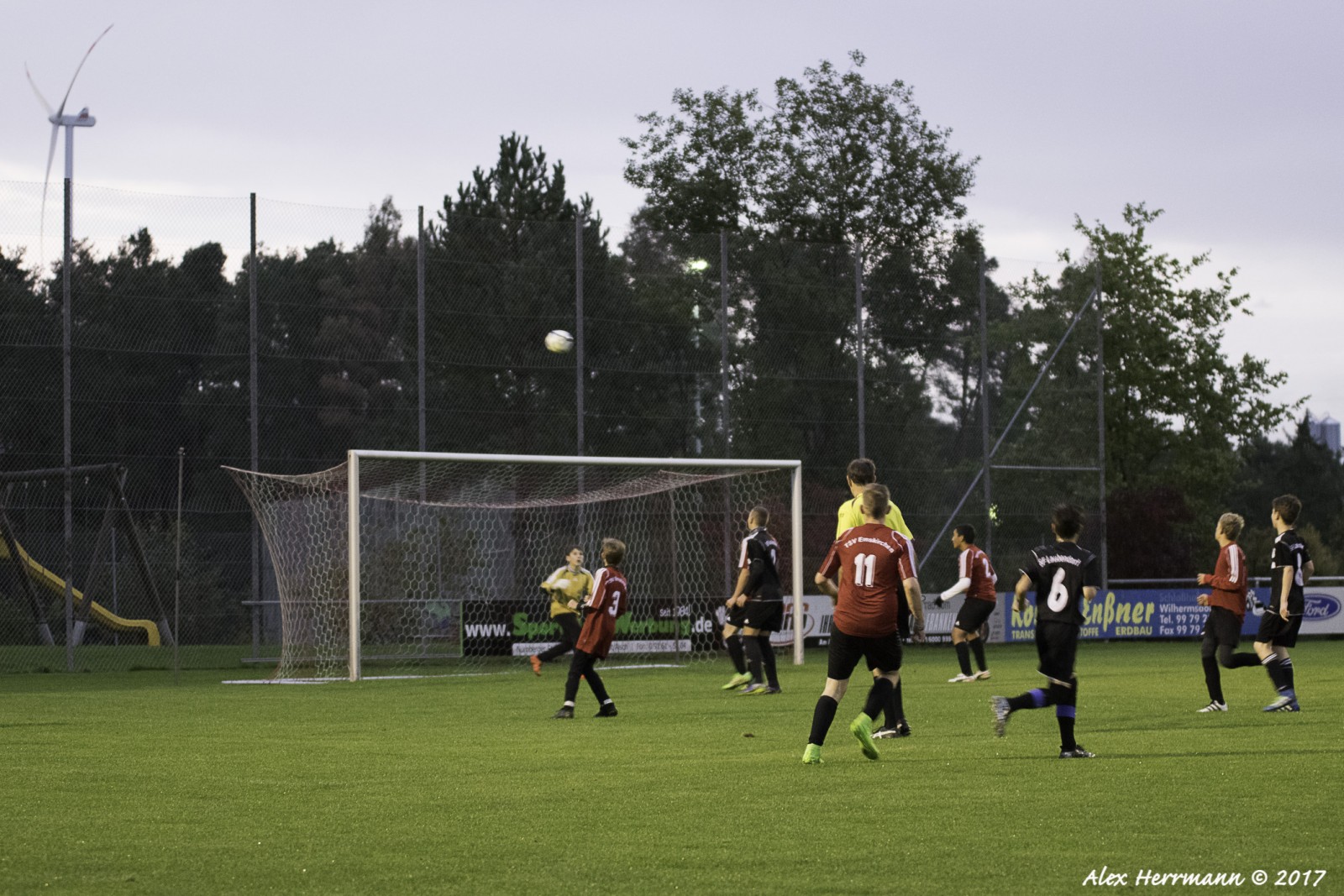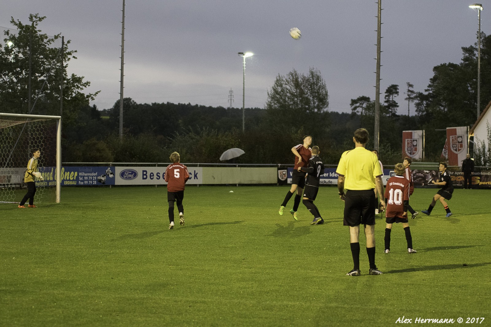 Nachdem unser Gegner den ersten Spieltermin absagen musste, fand am letzten Donnerstag nun das zweite Saisonspiel nach dem dritten statt. Die Wettervorhersage war leider alles andere als günstig, denn es stürmte und regnete als wir uns warm machten. Zum Spiel waren aber plötzlich Wind und Regen weg und wir legten los wie die Feuerwehr.  Nach einem kurzem Abtasten ging es mit dem 1:0 durch Kimi los und nach einer der vielen Ecken erzielte Kimi per Kopf auch gleich das 2:0. Lukas erhöhte durch einen tollen Weitschuss auf 3:0. Leider folgte dann eine Fehlentscheidung des ansonsten unaufgeregt leitenden Schiedsrichters. Isi war auf der Außenbahn auf dem Weg zum 16er und wurde von seinem Gegenspieler ins Straucheln gebracht (also klares Foul), beim Hinfallen ging allerdings auch sein Gegenspieler mit zu Boden und der Schiri gab Freistoß für die SG Emskirchen-Hagenbüchach.  Wir waren alle noch gedanklich auf dem Weg zum gegnerischen Tor und verteidigten leider nicht konsequent. Benni hatte keine Chance und somit stand es 1:3. Dies war dann auch der Pausenstand.