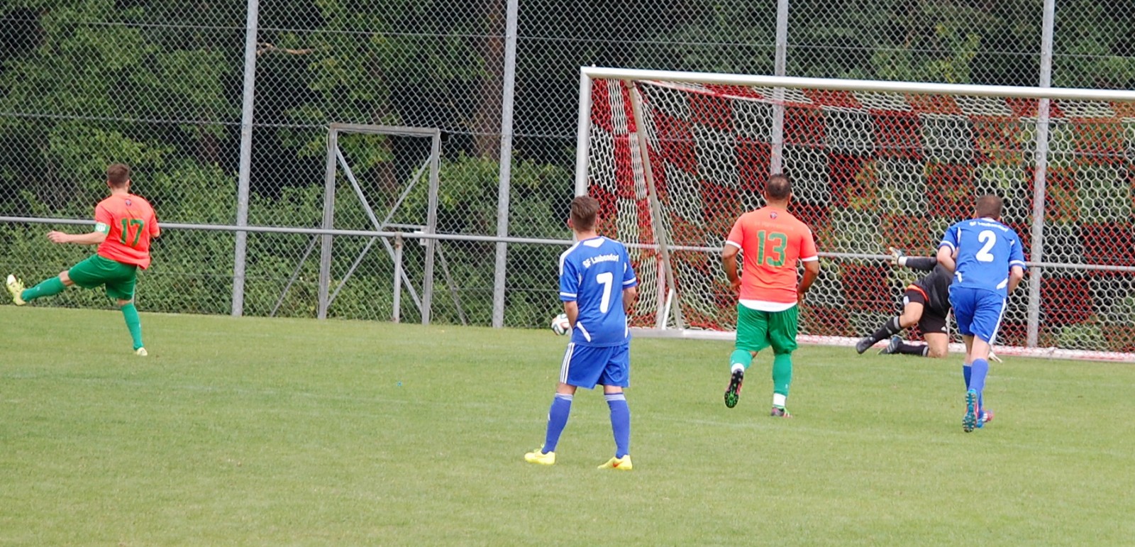 während Andi Becker ins rechte Eck reagiert, schießt der Gegner den 11-Meter am linken Pfosten vorbei ins Aus..