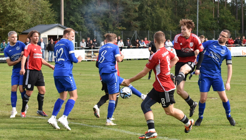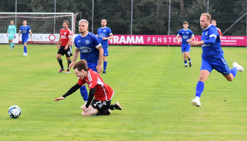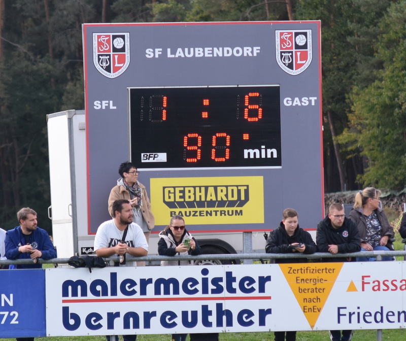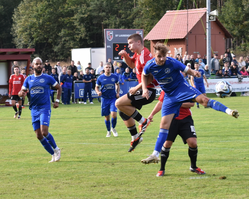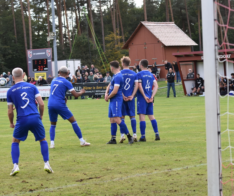 Die Gäste vom TSV starteten furios in ein in der ersten Hälfte rassiges Derby. Bereits in der 4. Spielminute wurde Peetz freigespielt und konnte den Laubendorfer Keeper umkurven und zur frühen Führung einschieben. Nur 2 Minuten später war er wieder zur Stelle und konnte eine weitere Vorlage zur 2-Tore Führung verwerten. In diesem Takt ging es weiter. Stumpf konnte seine Gegenspieler stehen lassen und stellte sogar auf 0:3 (8. Minute). Aber fast im Gegenzug meldete sich der SFL und konnte durch Hertlein auch seinen ersten Treffer verbuchen. Es entwickelte sich ein offener Schlagabtausch in dem beide Teams sehr gute Möglichkeiten hatten einen weiteren Treffer zu erzielen, doch die Chancen wurden meist vergeben. In der 32. Minute waren es erneut die Heimfans die jubeln konnten. Wassner brachte einen direkten Freistoß aus knapp 20 Metern sehenswert im rechten oberen Toreck unter. Dem vorangegangen war ein Platzverweis auf Seiten des TSV. Zarnescu war alleine auf dem Weg zum Tor und wurde von Hientz per Notbremse gestoppt. Nach dem Seitenwechsel wurde die Partie etwas zerfahrener. Langenzenn konzentrierte sich aufs Verteidigen und versuchte ab und an per Konter gefährlich zu werden. Laubendorf indessen konnte nicht so richtig Kapital aus der zahlenmäßigen Überlegenheit schlagen und agierte mit langen Bällen. Folge war eine zweite Hälfte, die nicht mehr so munter war wie die erste Hälfte und mit deutlich weniger Tormöglichkeiten. In den Schlussminuten versuchte es der SFL nochmal mit der Brechstange aber es gelang nicht sich eine klare Tormöglichkeit zu erarbeiten und am Ende stand das knappe Ergebnis aus der ersten Hälfte.