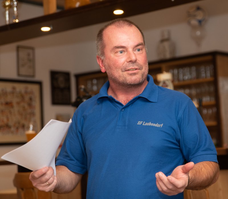 Zur Präsentation und Übergabe hatte der Hauptakteur, Ehrenvorstand Bernhard Jakob, viele Helferinnen und Helfer, aber auch Gäste aus allen Bereichen der Sport- und Sängerfreunde eingeladen. Neben der Vorstandschaft der Sportfreunde waren die vier Laubendorfer Stadträten*innen dabei, es fanden sich Vertreter*innen aus den Abteilungen der Sänger, Gymnastik, Ringen, Fitness und Fußball ein. Auch Pfarrerin Schönauer und Brauereichef Georg Hofmann waren der Einladung gefolgt. Besonders freute es den Ehrenvorstand, dass noch zwei Gründungsmitglieder aus dem Jahre 1958 leben, wobei einer davon, Josef Erhart, anwesend war. Er stellte alle Personen vor und nannte auch die Art der Unterstützung.
