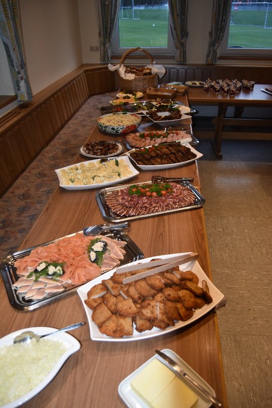 Das Sportheimteam um Annemarie Fleischmann hatte im Nebenzimmer ein Buffet aufgebaut, das keine Wünsche offenließ. Nach all den Vorträgen wurde es gerne angenommen. Zu Essen und Trinken liefen auf der Großleinwand einige Ausschnitte aus der umfangreichen Story, kommentiert vom Verfasser, Ehrenvorstand Bernhard Jakob. So klang ein höchst interessanter und unterhaltsamer Nachmittag in gemütlicher Runde aus, wo noch oft ein „weißt du noch“ erklang. Für das Durchforsten der Vereinsgeschichte sollte man sich Zeit nehmen, es lohnt sich allemal und dauert sicher nicht so lange wie die Erstellung.