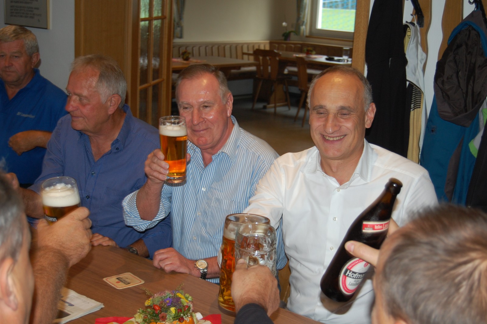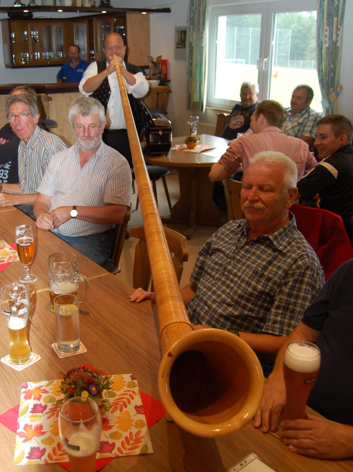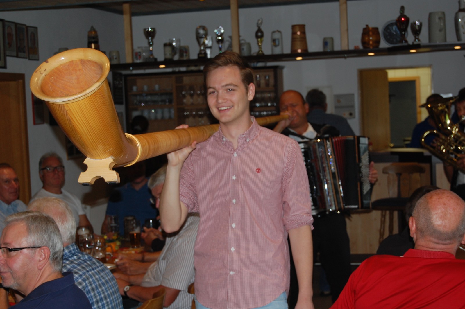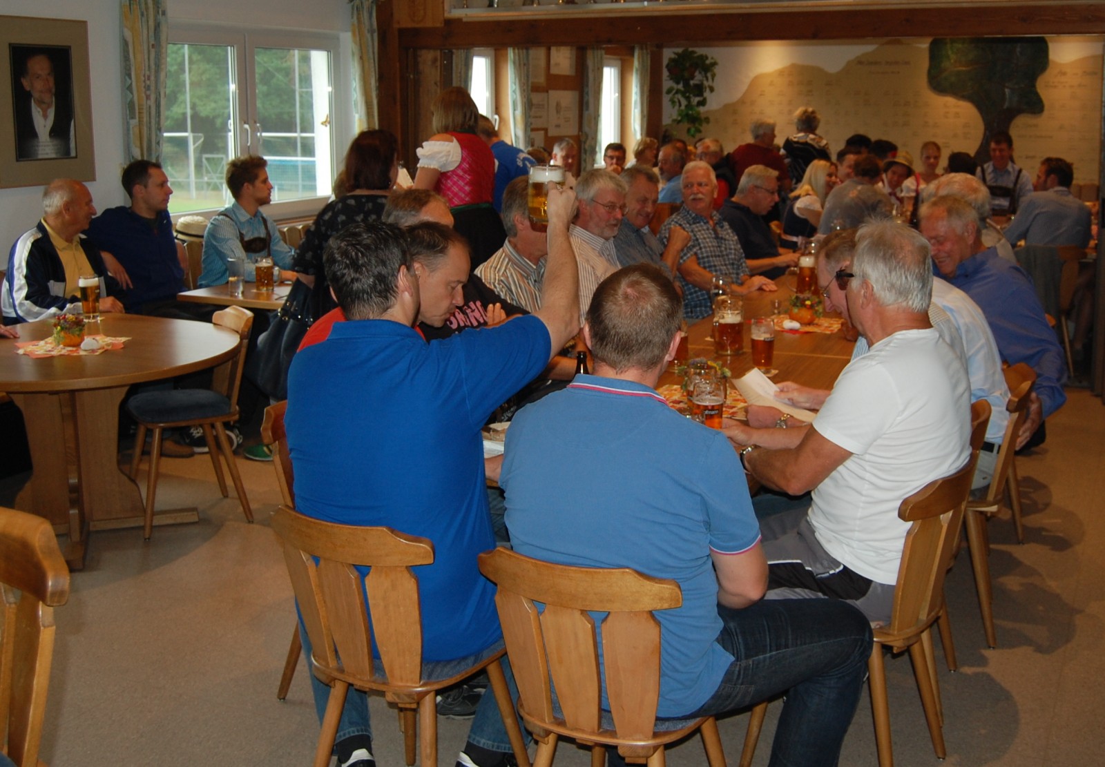 So verging die Zeit bis die Musik mit einem langen Alphorn einen zusätzlichen Höhepunkt einbaute. Dabei wurde Christoph Kanzler aus Burggrafenhof – gerade auf Heimaturlaub aus New York- als Statist gefordert und meisterte auch diese Aufgabe souverän. Dafür gab es extra Applaus und ein zusätzliches „ Prosit der Gemütlichkeit“. Gegen Mittag kamen aus der Küche dann größere Portionen in Form von Schnitzeln mit Pommes und alle Mittagsgäste wurden prompt bedient, darunter auch Bürgermeister Habel der einige Freimaßen spendierte. Manche Gäste machten sich dann auf den Heimweg und verpassten den obligatorischen Besuch von Brauereichef Georg Hofmann, der sich gerne unter „ seine Laubendorfer“ um SFL-Getränkenachschubchef Bernhard Jakob mischte und auch noch Freibier an allen Tischen verteilte. Während das toll arbeitende Sportheimteam Kaffee und Kuchen auftrug, wurde es etwas leerer im Sportheim, aber bei der guten Stimmung ging es sicher noch bis in den Abend hinein. So schön wie es war, hofft man auf eine Neuauflage in 2017, dann wenn möglich wieder im Biergarten bei Spätsommerwetter.