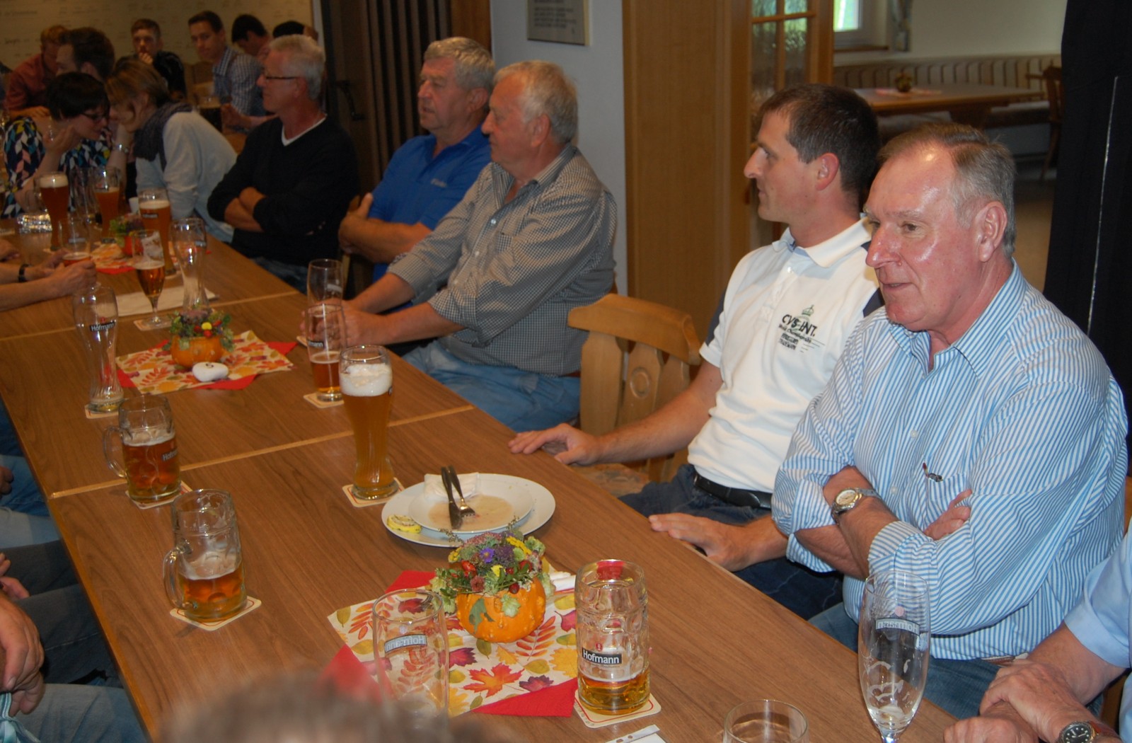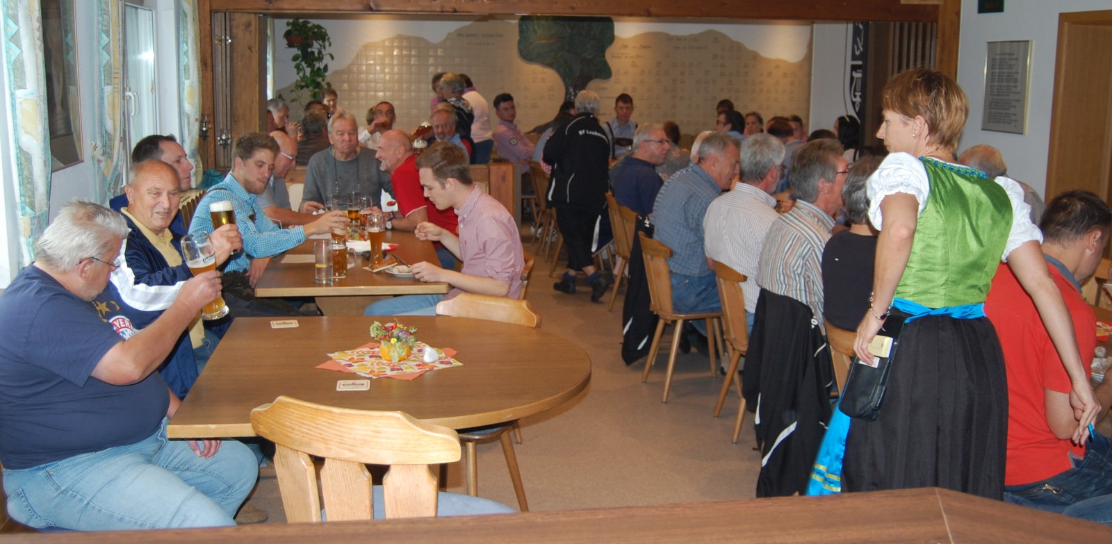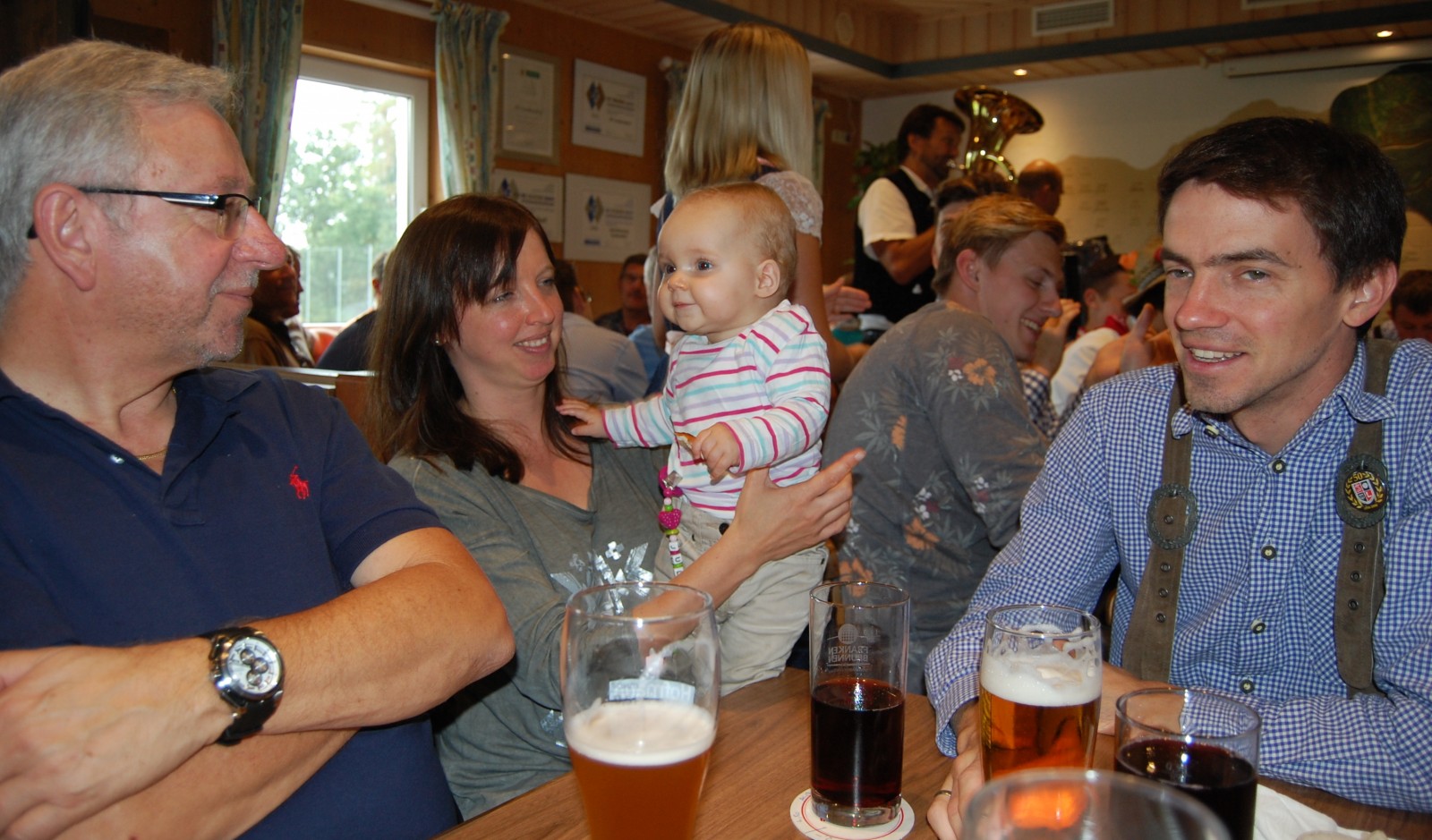 So verging die Zeit bis die Musik mit einem langen Alphorn einen zusätzlichen Höhepunkt einbaute. Dabei wurde Christoph Kanzler aus Burggrafenhof – gerade auf Heimaturlaub aus New York- als Statist gefordert und meisterte auch diese Aufgabe souverän. Dafür gab es extra Applaus und ein zusätzliches „ Prosit der Gemütlichkeit“. Gegen Mittag kamen aus der Küche dann größere Portionen in Form von Schnitzeln mit Pommes und alle Mittagsgäste wurden prompt bedient, darunter auch Bürgermeister Habel der einige Freimaßen spendierte. Manche Gäste machten sich dann auf den Heimweg und verpassten den obligatorischen Besuch von Brauereichef Georg Hofmann, der sich gerne unter „ seine Laubendorfer“ um SFL-Getränkenachschubchef Bernhard Jakob mischte und auch noch Freibier an allen Tischen verteilte. Während das toll arbeitende Sportheimteam Kaffee und Kuchen auftrug, wurde es etwas leerer im Sportheim, aber bei der guten Stimmung ging es sicher noch bis in den Abend hinein. So schön wie es war, hofft man auf eine Neuauflage in 2017, dann wenn möglich wieder im Biergarten bei Spätsommerwetter.