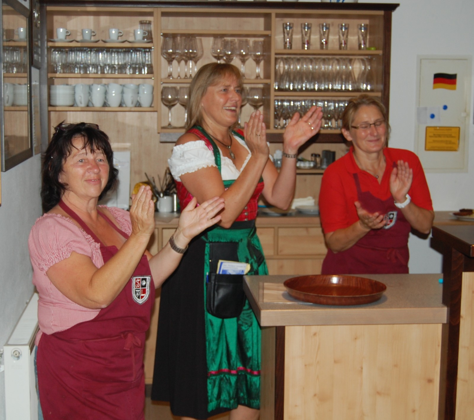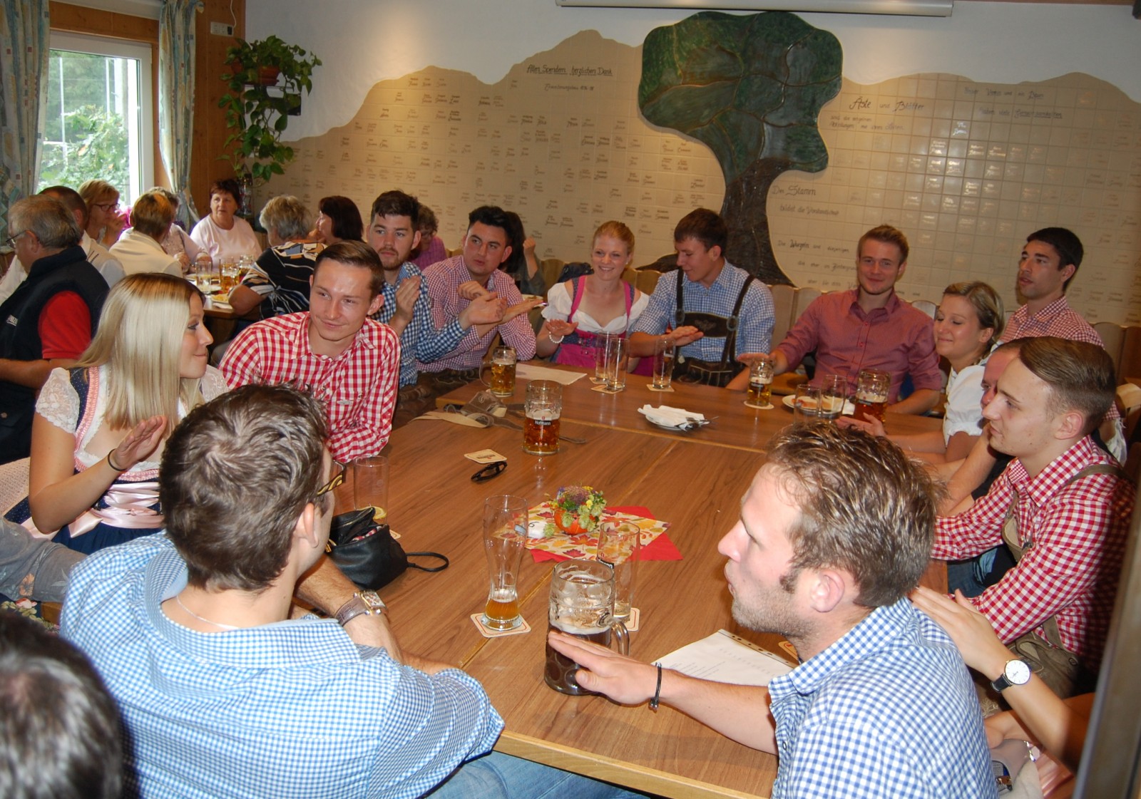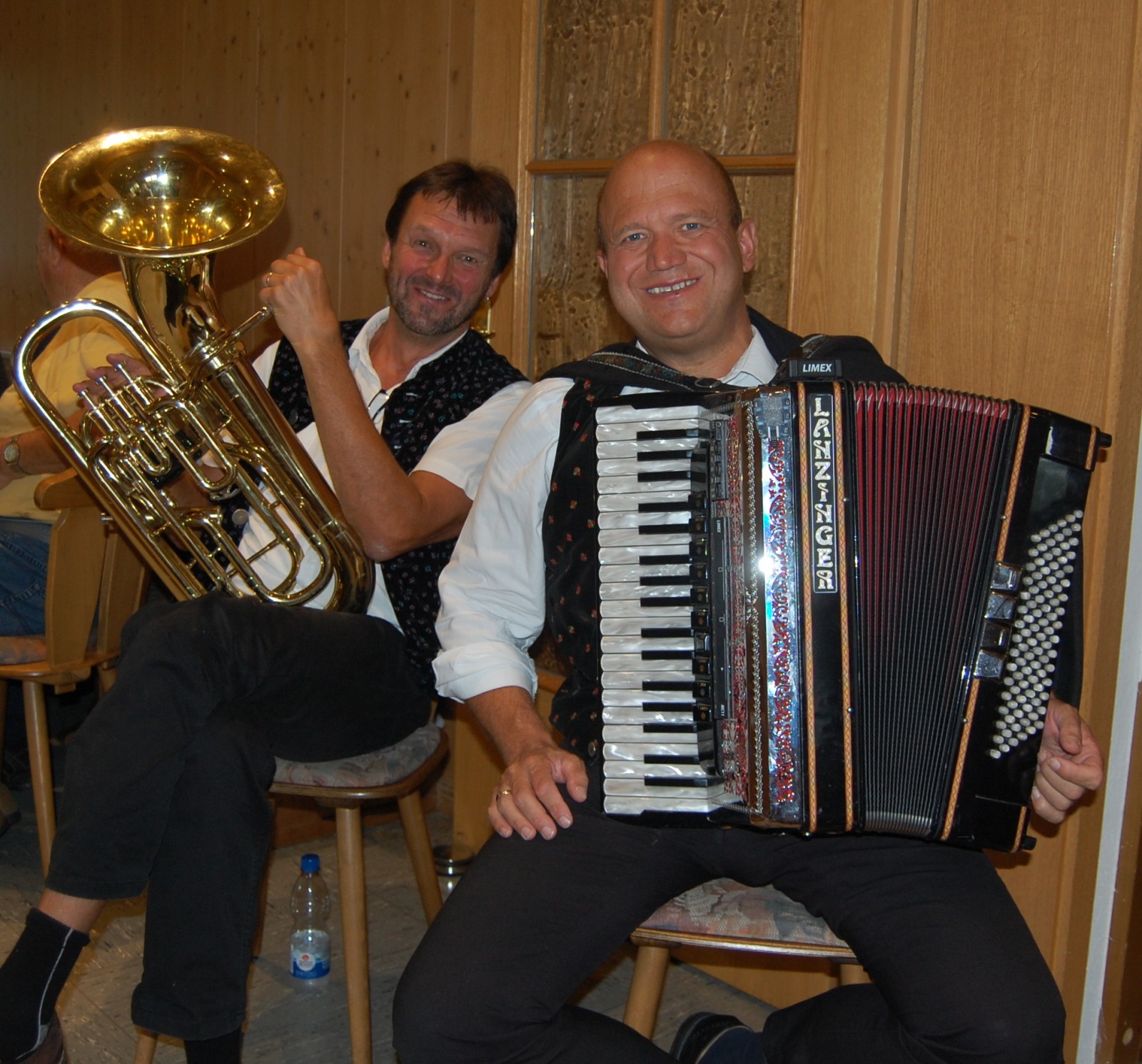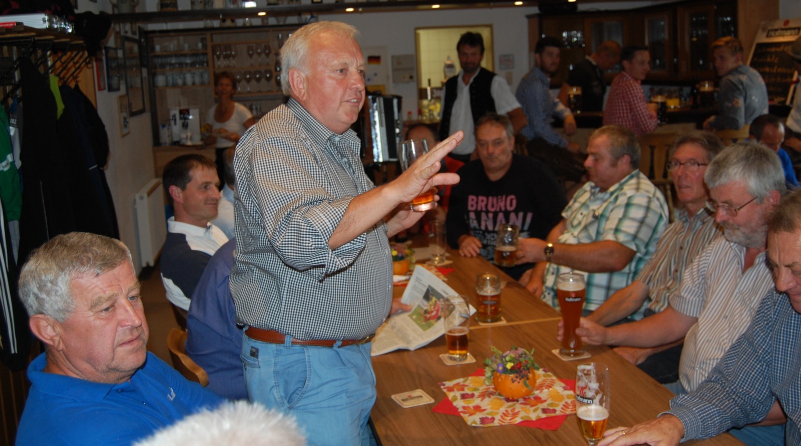 So verging die Zeit bis die Musik mit einem langen Alphorn einen zusätzlichen Höhepunkt einbaute. Dabei wurde Christoph Kanzler aus Burggrafenhof – gerade auf Heimaturlaub aus New York- als Statist gefordert und meisterte auch diese Aufgabe souverän. Dafür gab es extra Applaus und ein zusätzliches „ Prosit der Gemütlichkeit“. Gegen Mittag kamen aus der Küche dann größere Portionen in Form von Schnitzeln mit Pommes und alle Mittagsgäste wurden prompt bedient, darunter auch Bürgermeister Habel der einige Freimaßen spendierte. Manche Gäste machten sich dann auf den Heimweg und verpassten den obligatorischen Besuch von Brauereichef Georg Hofmann, der sich gerne unter „ seine Laubendorfer“ um SFL-Getränkenachschubchef Bernhard Jakob mischte und auch noch Freibier an allen Tischen verteilte. Während das toll arbeitende Sportheimteam Kaffee und Kuchen auftrug, wurde es etwas leerer im Sportheim, aber bei der guten Stimmung ging es sicher noch bis in den Abend hinein. So schön wie es war, hofft man auf eine Neuauflage in 2017, dann wenn möglich wieder im Biergarten bei Spätsommerwetter.