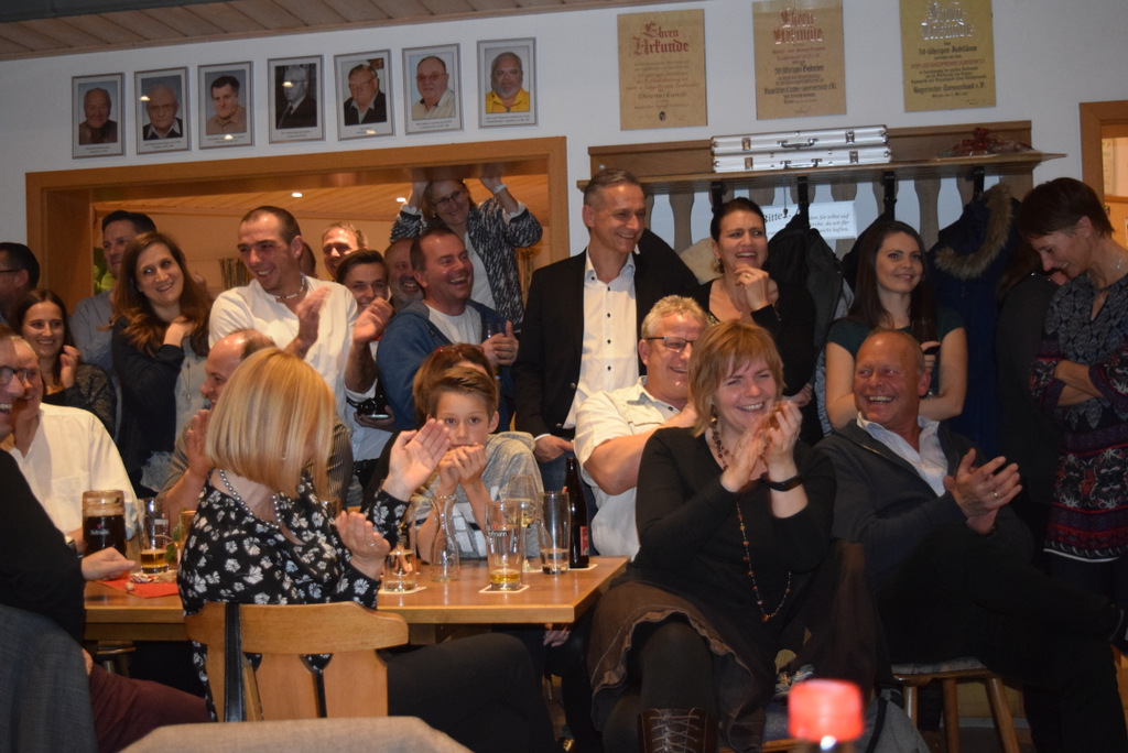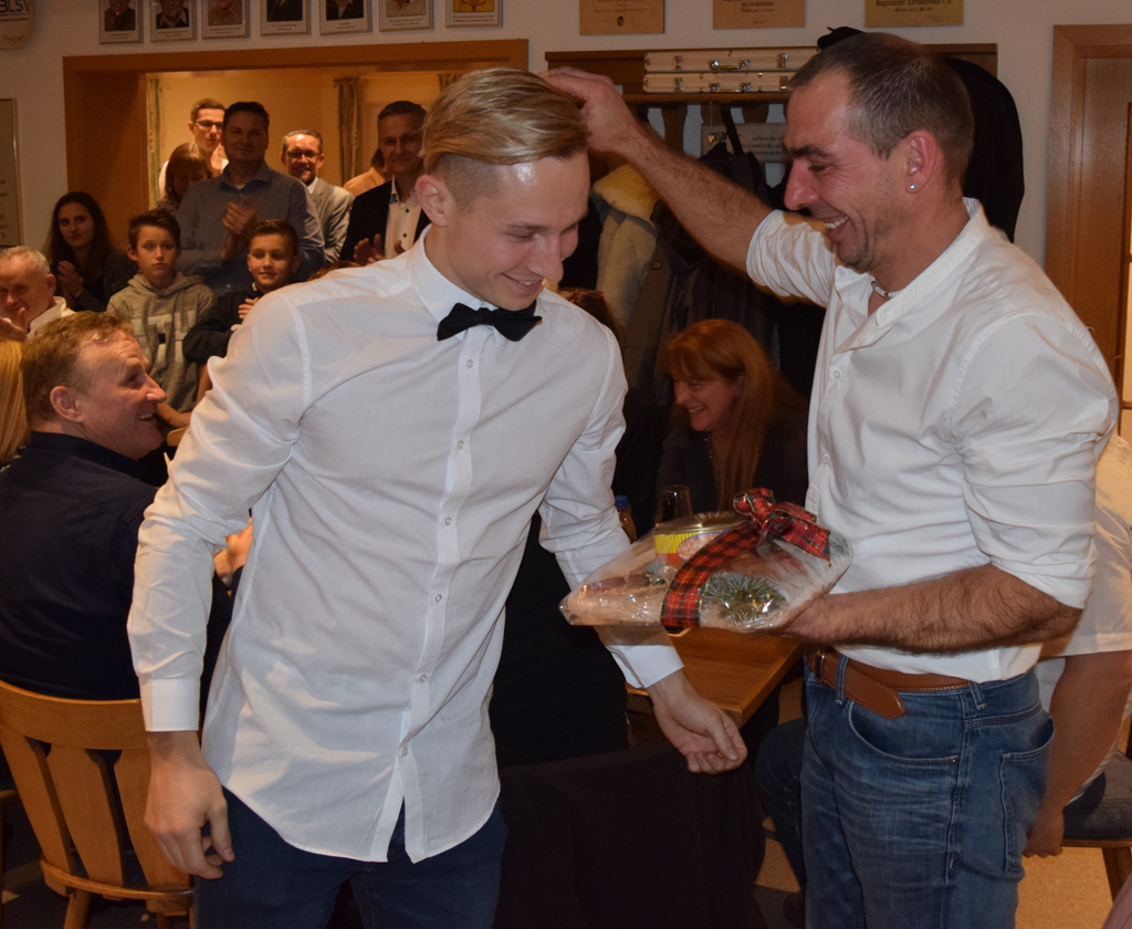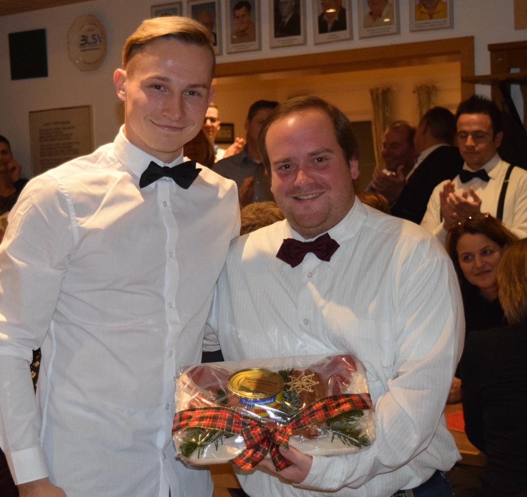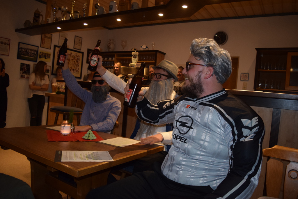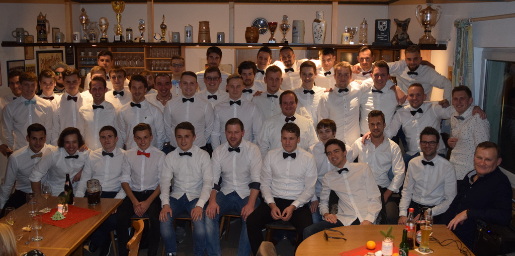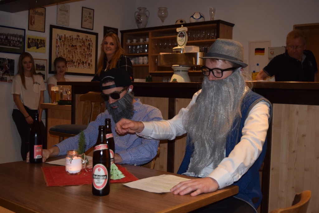 Die Ehrungen begannen mit Geschenken an die beiden Trainer und setzen sich dann über die Spielleiter, Platzwarte bis zu den Sponsoren fort. Mit Spannung wurde die schon legendäre Ansprache des jüngsten Spielers erwartet. In diesem Jahr war Kevin Heubeck der Auserkorene, er machte sein Sache gut und wurde mit viel Beifall entlassen. Zum Abschluss des offiziellen Teiles der Weihnachtsfeier hatte Stephan Schmidt einen Sketch vorbereitet, der alle Besucher ins Jahr 2077 entführte. Dort trafen sich immer noch mittwochs beim Stammtisch der alten Herren in die Jahre gekommene bärtige Altinternationale der Sportfreunde. Sie blickten voller Stolz auf das Jahr 2018 zurück, wo die Meisterschaft und der Aufstieg in die Kreisliga so frühzeitig gefeiert werden konnte, dass die AH zum letzten Punktspiel nach Wilhermsdorf geschickt wurde, während sie, die Spieler der Ersten, bereits auf „Malle“ gefeiert haben. Diesem Wunsch ist nichts hinzuzufügen, nun muss er nur noch Wirklichkeit werden. Mit einem gemeinsamen Foto aller Spieler wurde der offizielle Teil der Weihnachtsfeier abgeschlossen. Danach ging die Feier bei bestem Service noch lange weiter.