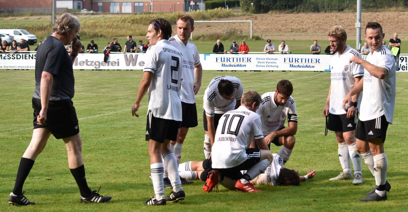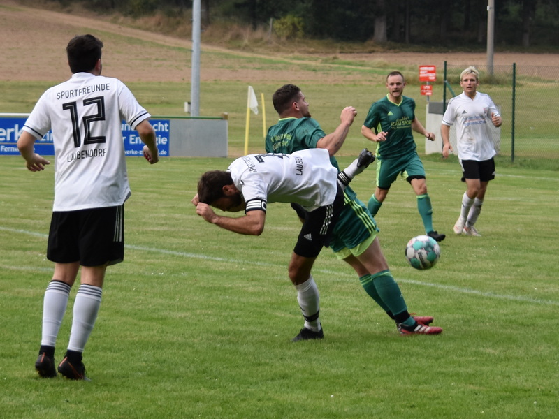 In der ersten Hälfte lieferten sich beide Mannschaften einen offenen Schlagabtausch. Horneber konnte die Gäste nach 10 Minuten in Führung bringen. Aber nur zwei Zeigerumdrehungen später stellte Schmutzer per Strafstoß auf 1:1. Wieder nur 3 Minuten später führte erneut der SFL. Dieses Mal war der Torschütze aber von der Heimmannschaft. Ring lenkte eine Hereingabe unglücklich ins eigene Tor. Danach wurde es etwas ruhiger mit Toren und die mitgereisten Zuschauer mussten bis zur 32. Minute warten. Erneut Horneber konnte per Kopf das 1:3 erzielen nach einem Eckball von Wassner. Doch die Antwort der Hausherren ließ wieder nicht lange auf sich warten und nur 3 Minuten nach dem Treffer der Laubendorfer verkürzte Hüttinger auf 2:3. Danach wäre eigentlich Halbzeit gewesen, doch Laubendorfs Bantak holte sich quasi mit dem Pausenpfiff noch die Ampelkarte, als er seine wegen Meckerns erhaltene gelbe Karte beklatschte. Somit musste der SFL die 2. Hälfte mit einem Mann weniger beginnen. Nach dem Seitenwechsel wurde das mit dem Schlagabtausch etwas zu wörtlich genommen und es reihten sich viele kleine Fouls und Unterbrechungen aneinander, wodurch nie so richtig Spielfluss aufkam. Die Heimelf konnte ihre Überzahl auch nicht ausspielen. Laubendorf verteidigte gut und versuchte durch Konter gefährlich zu sein. In der 89. Minute schließlich, nach einem Ballverlust bei eigenem Freistoß der Hausherren, kam Seiwerth an den Ball und konnte nur durch ein Foul gestoppt werden. Der Schiri zeigte auch hier auf den Punkt. Wassner verwandelte zur 2:4 Entscheidung und sorgte wenigstens für einen Treffer in der 2. Hälfte. Der Schlusspunkt war die rote Karte von Hüttinger in der Nachspielzeit wegen Einsteigens von Hinten.