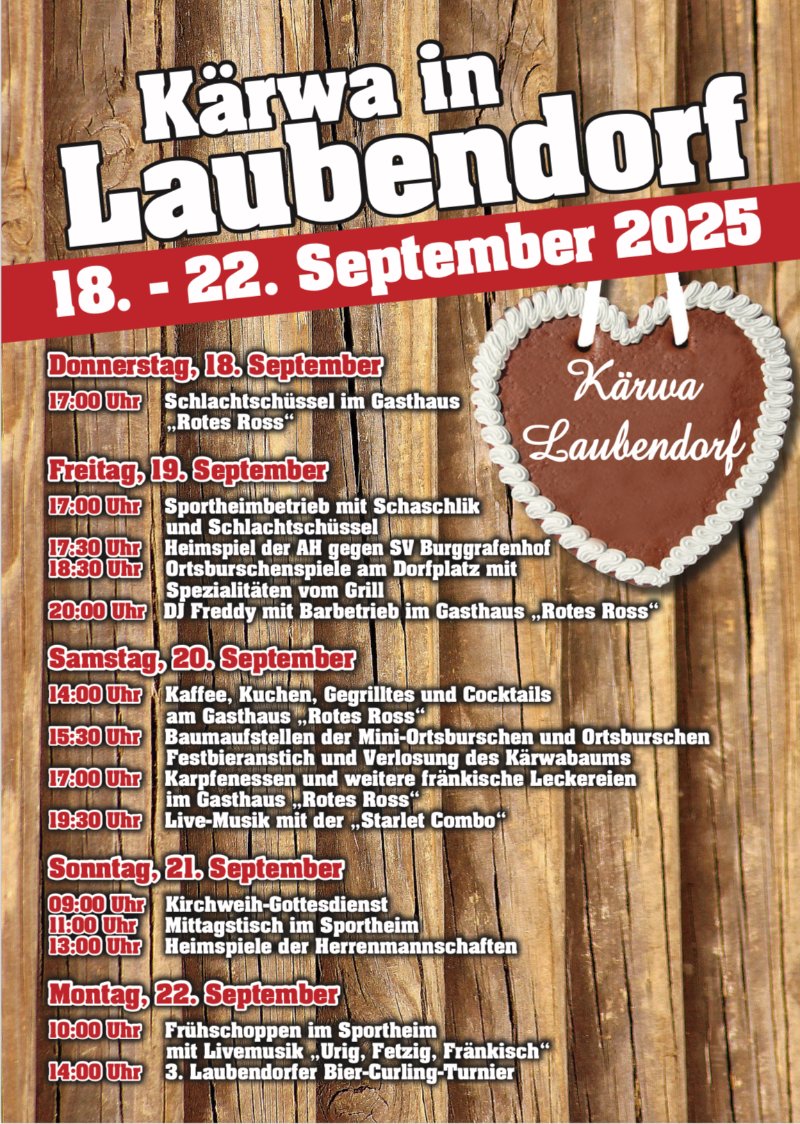 Vom 18. bis 22. September 2025 lädt Laubendorf wieder herzlich zur traditionellen Kärwa ein. Fünf Tage lang erwartet euch ein vielfältiges Programm voller Spaß, gutem Essen und geselligem Beisammensein. Die Sportfreunde Laubendorf laden gemeinsam mit den Ortsburschen und Kärwamadli, der Freiwilligen Feuerwehr Laubendorf und dem Gasthaus Höfler herzlich dazu ein.