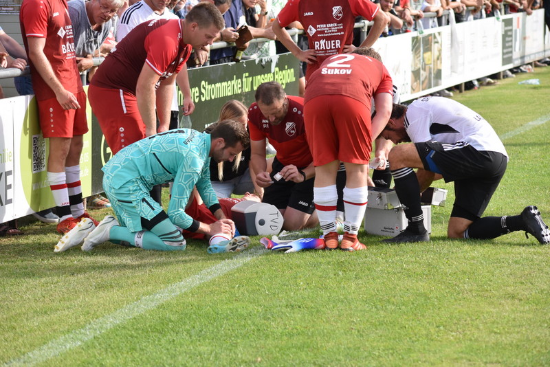 dann der Schreck des Nachmittags, der TV-Spieler prallt an die Bande und zieht sich eine stark blutende Wunde zu