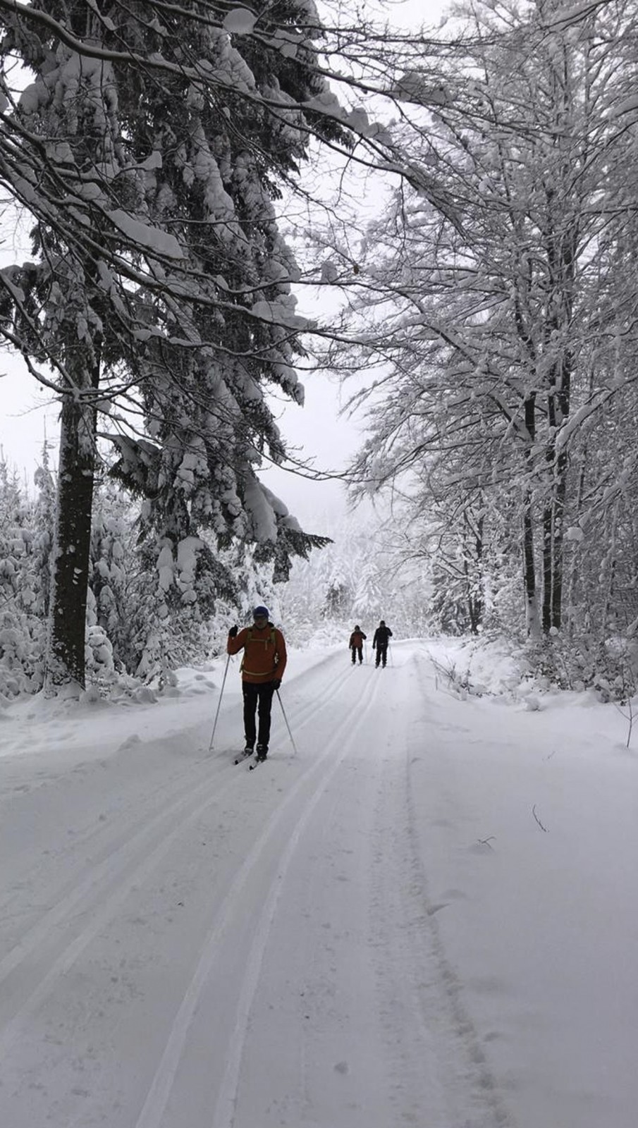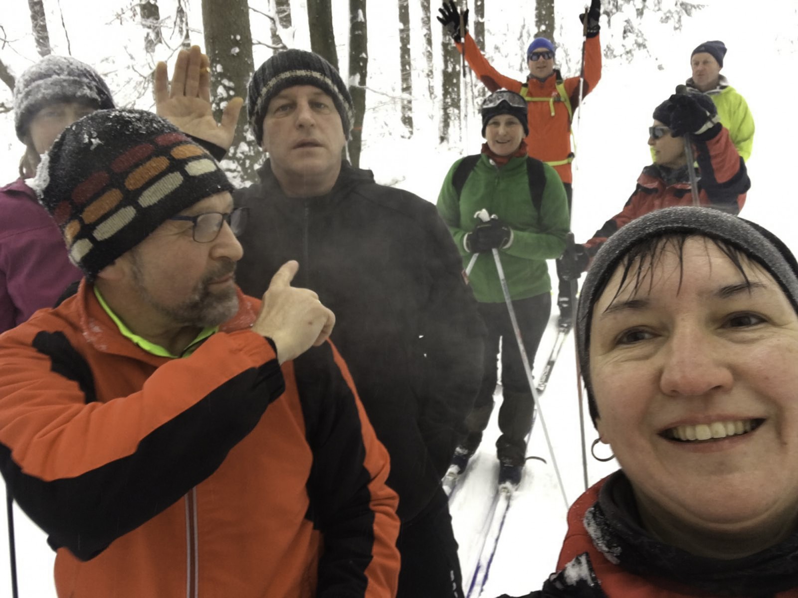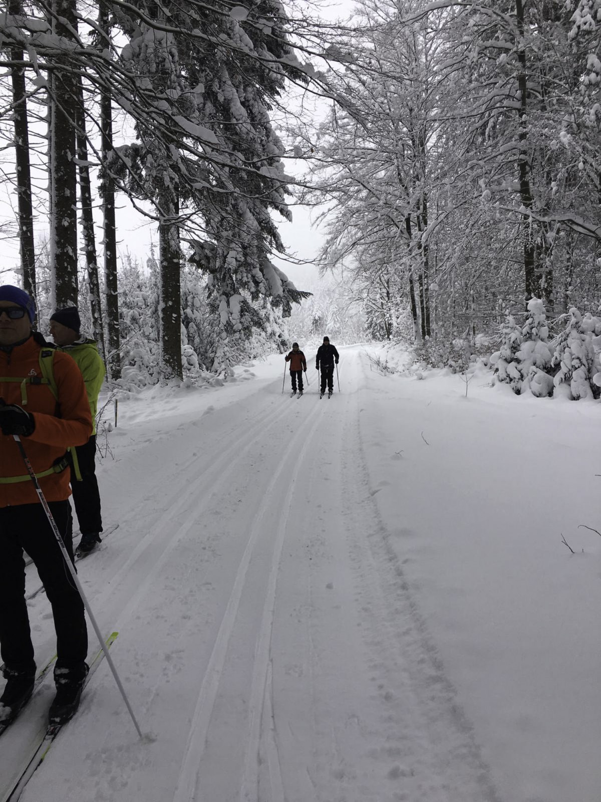 Für Samstag war weiterhin Schneefall angesagt und wir hatten uns überlegt, einen Teil der Bayerwaldloipe zu fahren. Gesagt getan, Start ist in Mauth. Also alle am Loipenstüberl vorbei zum Ausgangspunkt. Wir trafen dort auf den Loipenwart und dieser teilte uns mit, dass wir mit unserer Wunschloipe leider nicht rechnen können, da diese nicht mehr gespurt wird und erst im nächsten Jahr neu angelegt werden soll. Unser ganzer Plan leider für die Katz. Also zu Fuß nach Mauth und den Einstieg für die nächste Tour genommen. Es ging mitten durch den verschneiten Wald und dann immer weiter über einen Hügel hinauf. Wo man hinauf geht, muss man auch wieder hinunter. Etwas steiler und da gibt es dann keine Loipe mehr. Hiltzi übernahm die Führung und verschwand hinter einem Schneehügel. Auf einmal hörten wir einen Schrei und die Nachfolgenden fanden Hiltzi im Tiefschnee wieder. Nach der Abfahrt ging es gleich in den Wald und ins ungewisse hineinfahren wollte Hiltzi nicht von daher bremste er im Tiefschnee. Alles gut gegangen. Am Ende der Route (nach 12,5 km) sind wir dann an einem Sportplatzparkplatz gelandet. Leider ohne Verpflegungsmöglichkeit. Das Groh der Truppe fuhr dann zurück. Heide und Booker holten freundlicherweise, die etwas angeschlagenen von dort ab.