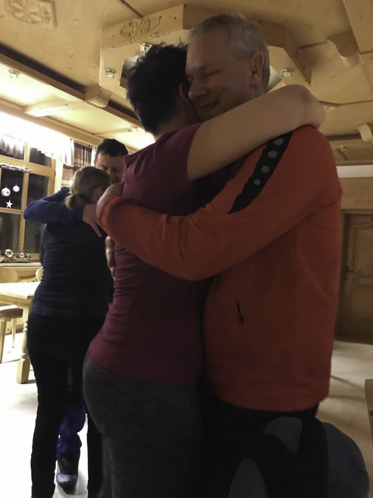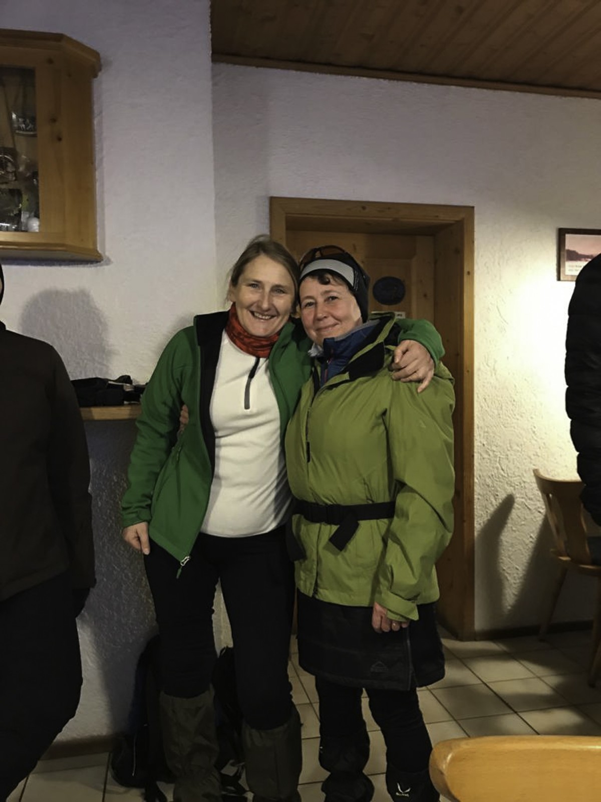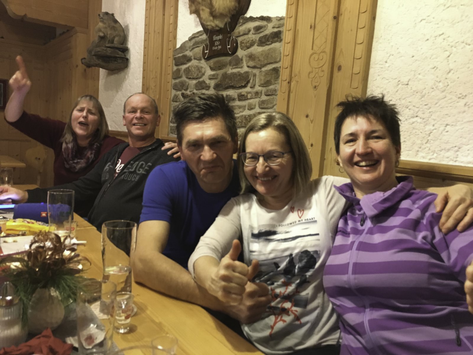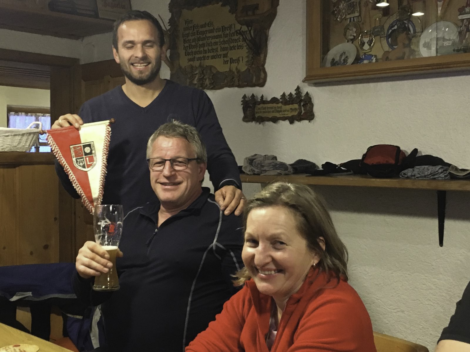 Leider haben wir schon sehr viel Zeit verloren und es reichte nur für einen kurzen Tripp zum Loipenstüberl. Michi hatte einen SFL-Wimpel dabei und dieser wurde dann feierlich übergeben. Traditionell haben wir dann eine Runde „Blutwurz“ und weitere Spiritousen zu uns genommen. Dann mussten wir schon wieder los, das Abendessen und auch Kai und Susanne sowie Booker und Heide warteten schon.