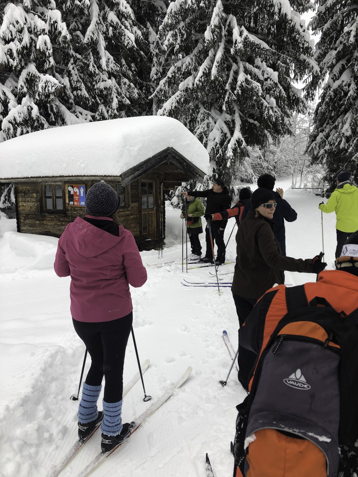Pläne für Sonntag wurden geschmiedet und wieder verworfen. Die aktuelle Schneelage (es schneite weiterhin) lies leider nur eine Tour rund um das Loipenstüberl zu. Wegen der Skiabgabe mussten wir uns aufteilen und es dauerte eine Weile bis die Gruppe wieder zusammen war. Nach der Runde im Tal ging es für die einen ins Loipenstüberl zum Vespern und für die Anderen hinauf zum Kilger. Wo wir uns nach der Skiabgabe dann wieder getroffen haben.