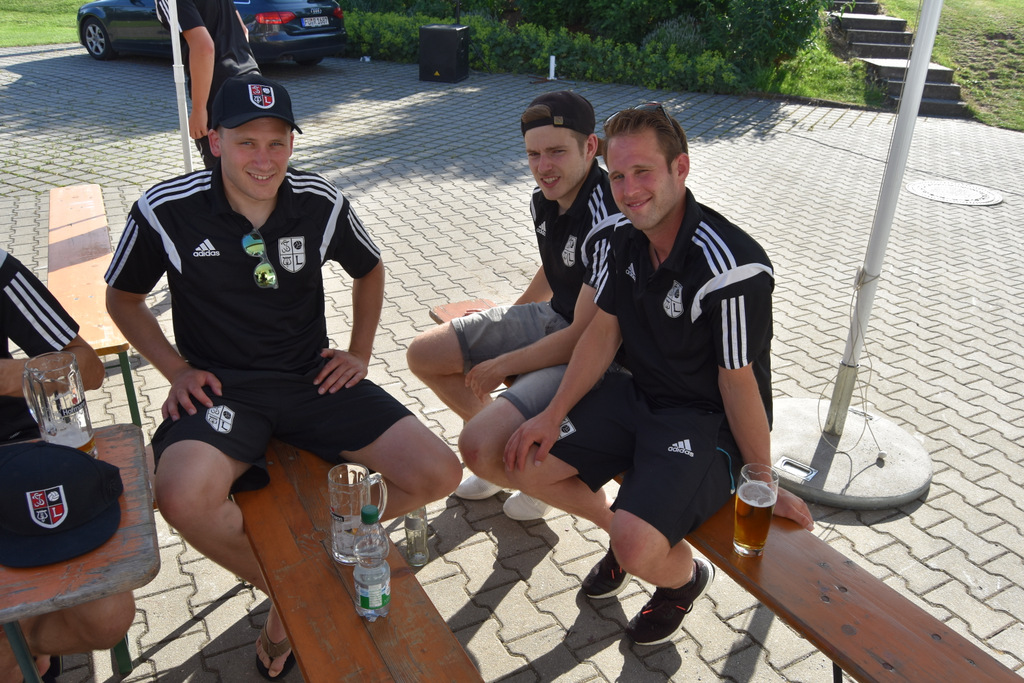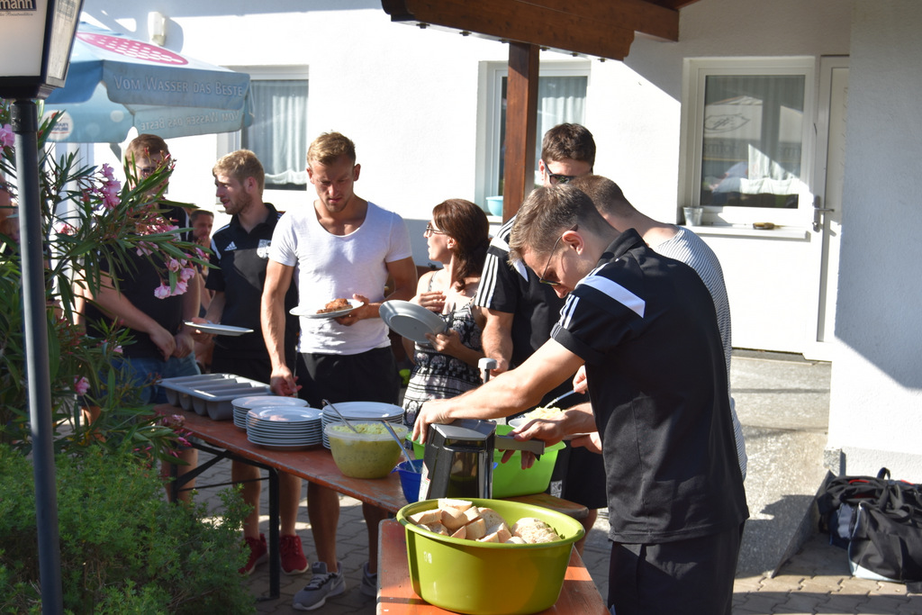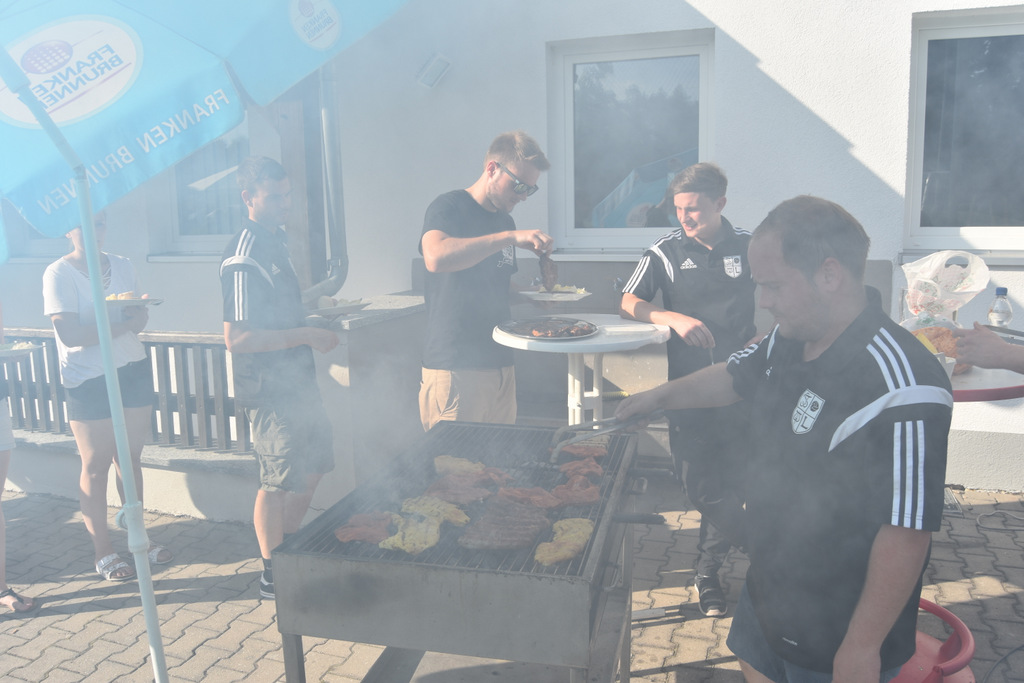 Es ist guter Brauch, dass die beiden Mannschaften nach dem letzten Heimspiel eine Grillfeier mit Fans und Sponsoren veranstalten. Dieses Mal stand zunächst noch ein wichtiger Fototermin an. Die neu angeschafften Trainingsanzüge sollten mit Spielern, Trainern und Sponsoren ins rechte Licht gesetzt werden. Bei den sommerlichen Temperaturen eine weitere schweißtreibende Aktion an diesem Nachmittag. Doch die Bilder können sich sehen lassen und der Dank ging noch einmal an Wolfgang Erhart, Reiner Rückl und Thomas Keppner, die hier – einmal mehr- die notwendige finanzielle Unterstützung gewährt hatten. Dann glühte der Grill und es dauerte einige Zeit bis alle Hungrigen Fleisch und Würste mit Salaten verkostet hatten. Bei musikalischer Unterhaltung und guten Gesprächen ging das gemütliche Zusammensein bis in den späten Abend.
