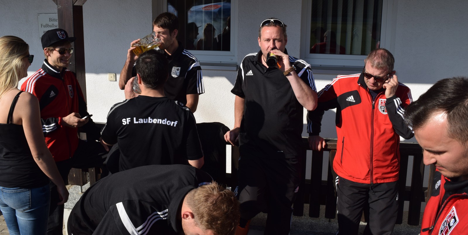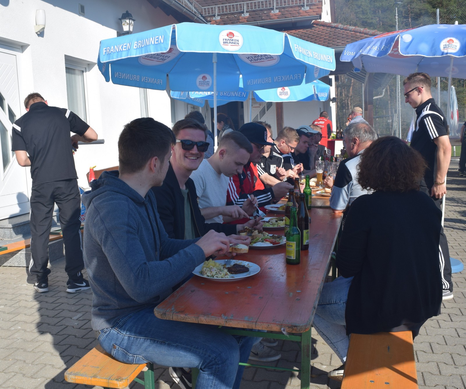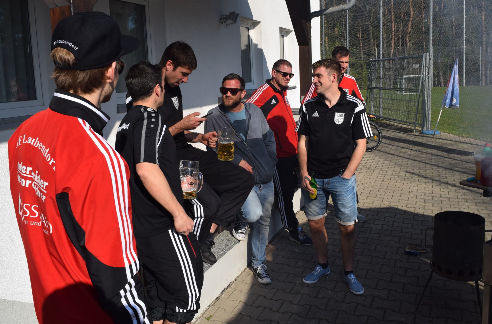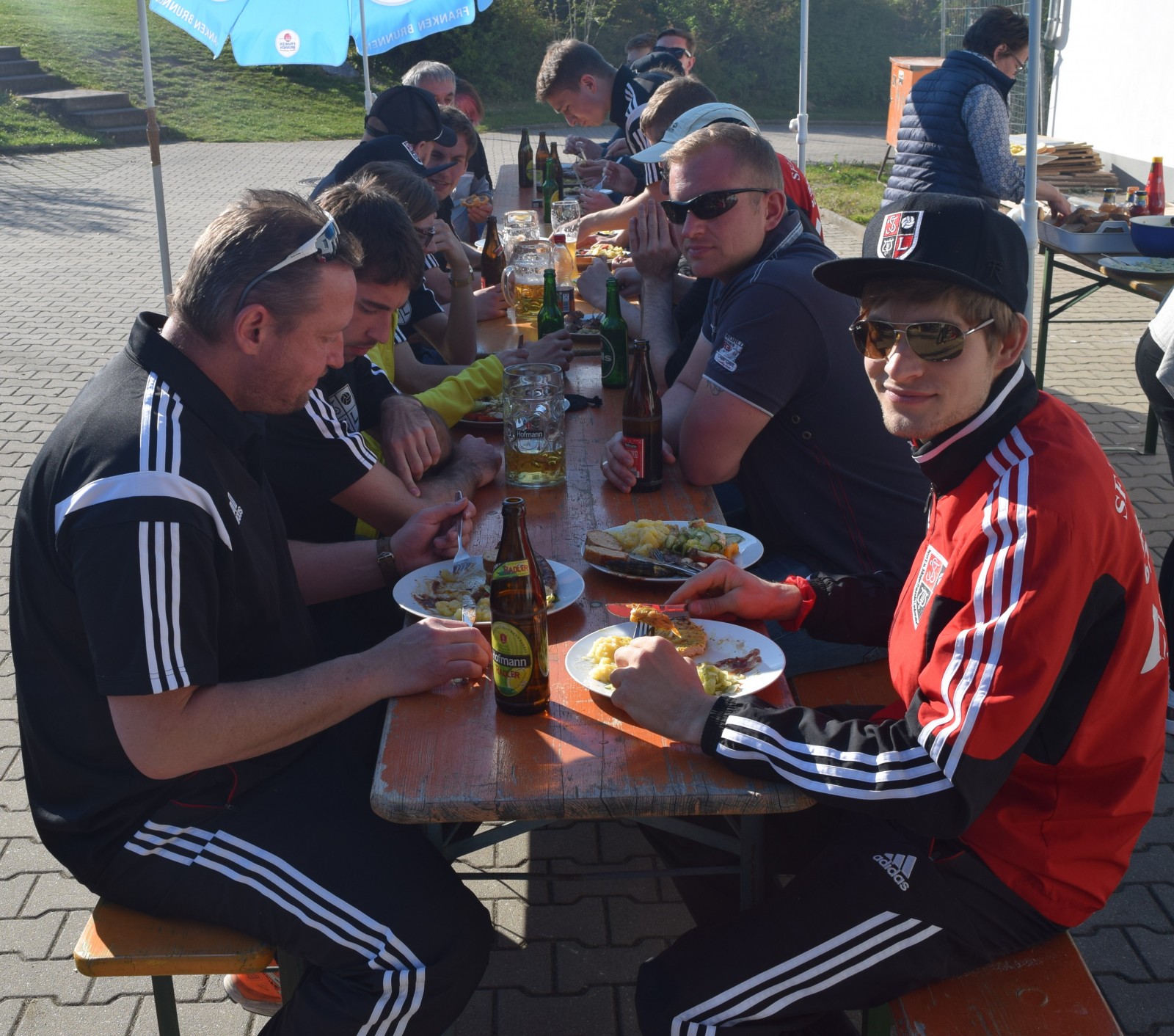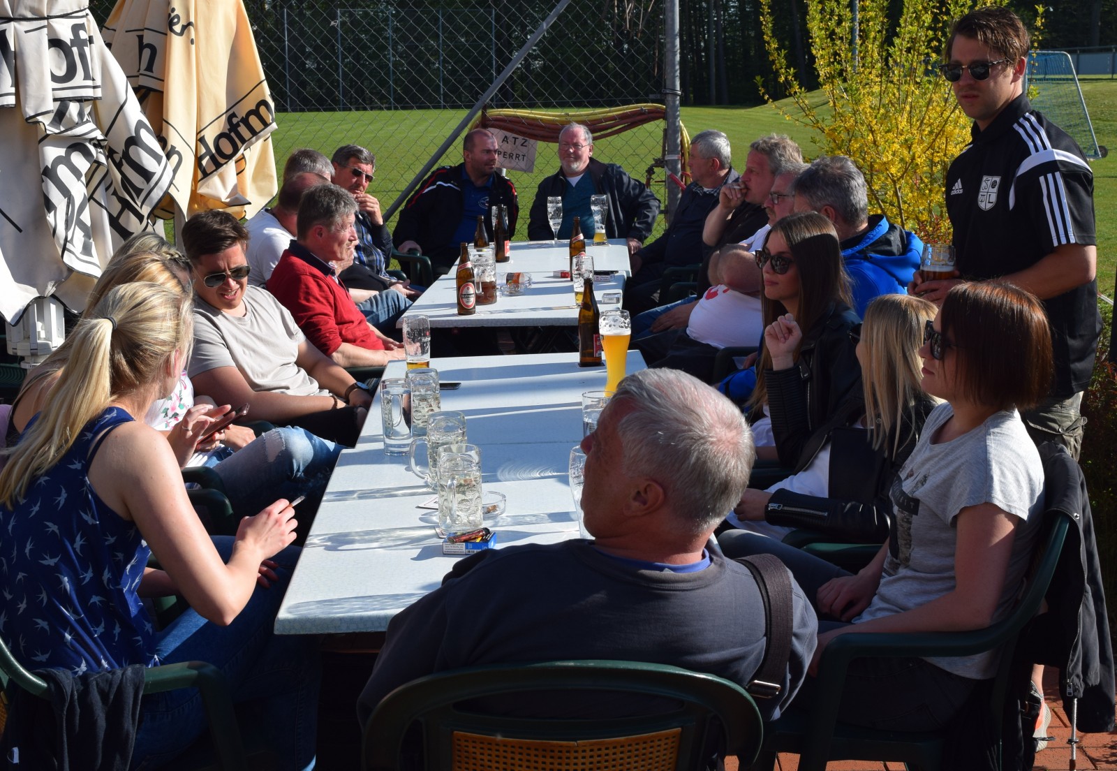 Kaum waren alle Tore im obligatorischen Kreis von Mannschaft, Betreuern und Edelfans gebührend laut gefeiert worden, füllte sich der Biergarten und der Grill wurde „angeworfen“. Fleißige Hände hatten ein wirklich stattliches und opulentes Salatbuffet aufgetischt, das keine Wünsche offen ließ. Es dauerte dann einige Zeit bis die ersten Grillprodukte fertig waren und unter die Hungrigen gebracht wurden. Die Zeit dazwischen wurde mit Gesprächen über die vorausgegangenen Spiele verbracht und die anderen Ergebnisse einschließlich Tabellenstand gegoogelt . Dabei wurde der zweiten Mannschaft ein wirklich gutes Spiel gegen den Tabellenzweiten aus Boxdorf attestiert. Was den hohen Sieg gegen den Tabellenletzten aus Emskirchen betraf, so wurde hier von Trainer und Spielern durchaus selbstkritisch zugegeben, dass das Spiel kein Glanzlicht gewesen war. Trotzdem ist nach dem 21. Spieltag anzumerken, dass man bereits Vizemeister geworden ist, selbst wenn man alle fünf noch folgenden Spiele verlieren sollte. Ein Vorsprung von sage und schreibe 19 Punkten und ein um 48 Tore besseres Torverhältnis auf den Tabellendritten hat es (wahrscheinlich) weder so in der Kreisklasse und natürlich auch noch nie bei der 1. Mannschaft zu so einem frühen Zeitpunkt in der Saison gegeben!? Das ist schon eine tolle Leistung, aber die Saison ist ja noch nicht zu Ende. Wenn sich unsere Erste in den nächsten beiden Spielen keinen Ausrutscher leistet, dann kommt es am 21. Mai in Gutenstetten zum absoluten Saisonhöhepunkt zwischen den beiden Ersten in der Tabelle. Sollten wir da gewinnen und wären beide Mannschaften zum Saisonende punktgleich, so würde der direkte Vergleich um die Meisterschaft zu Gunsten der Sportfreunde sprechen. Aber bis dorthin ist es noch ein hartes Stück Arbeit und es warten außer Steinachgrund mit dem wiedererstarkten SC Trautskirchen und der SG Obernzenn noch richtig gute Gegner. Also fünf Endspiele beginnend mit der weiten Reise nach Hohlach am nächsten Sonntag.
