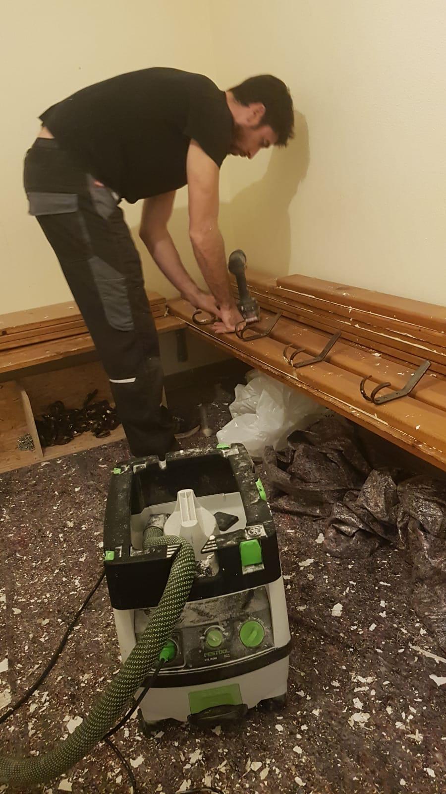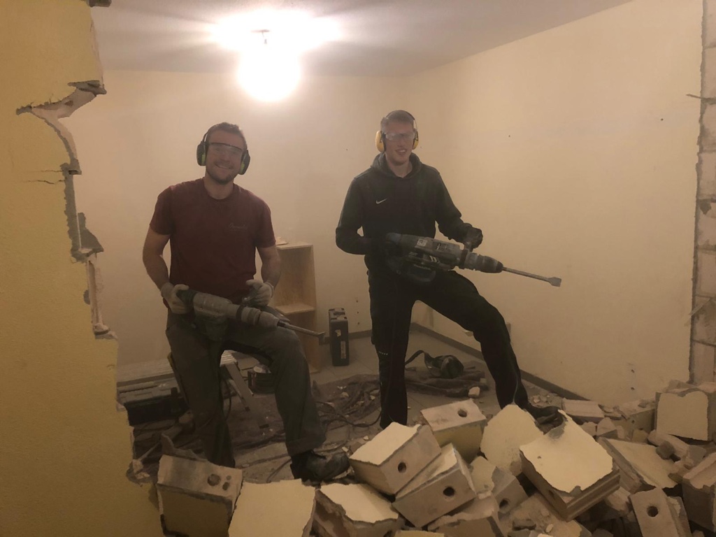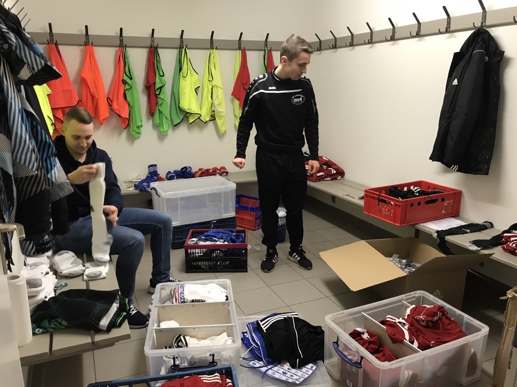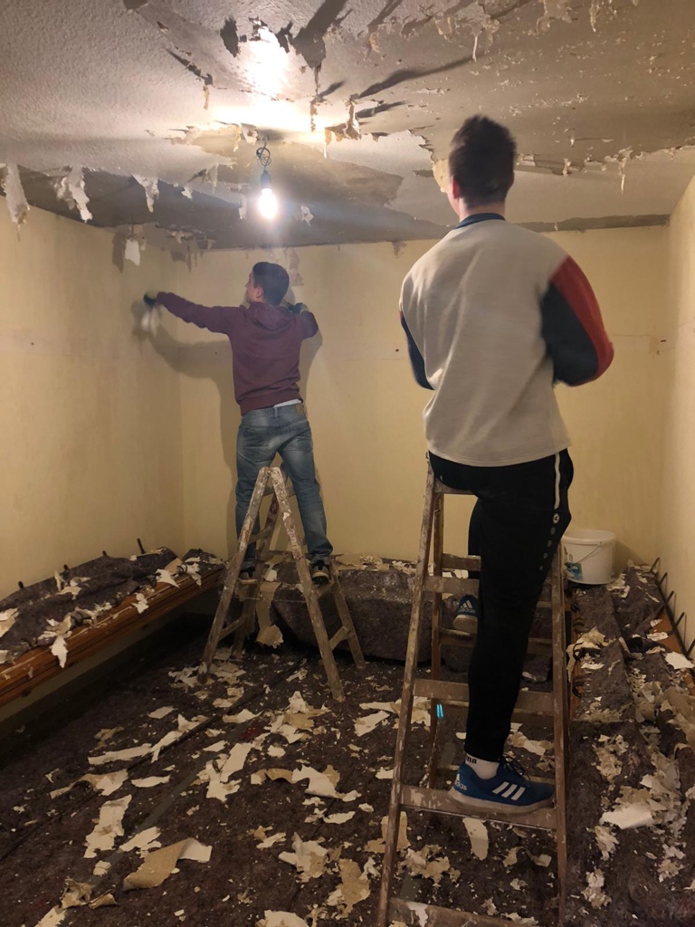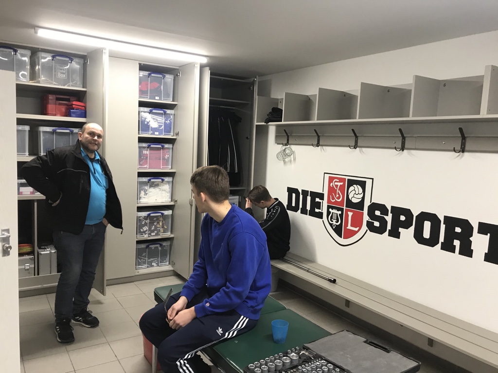 Wände wurden durchbrochen, alte Tapeten entfernt, neue Stromleitungen verlegt, Holz wurde geschliffen, lackiert und perfekt auf die neuen Maße angepasst. Alte Stutzen, Trikots und Hosen wurden aussortiert.