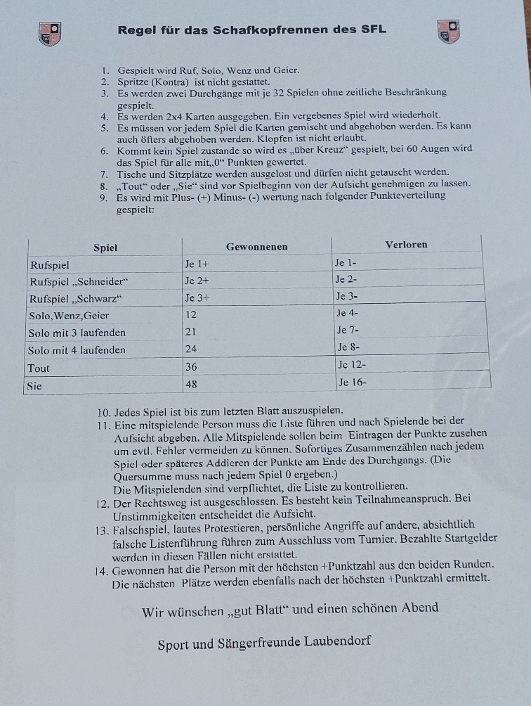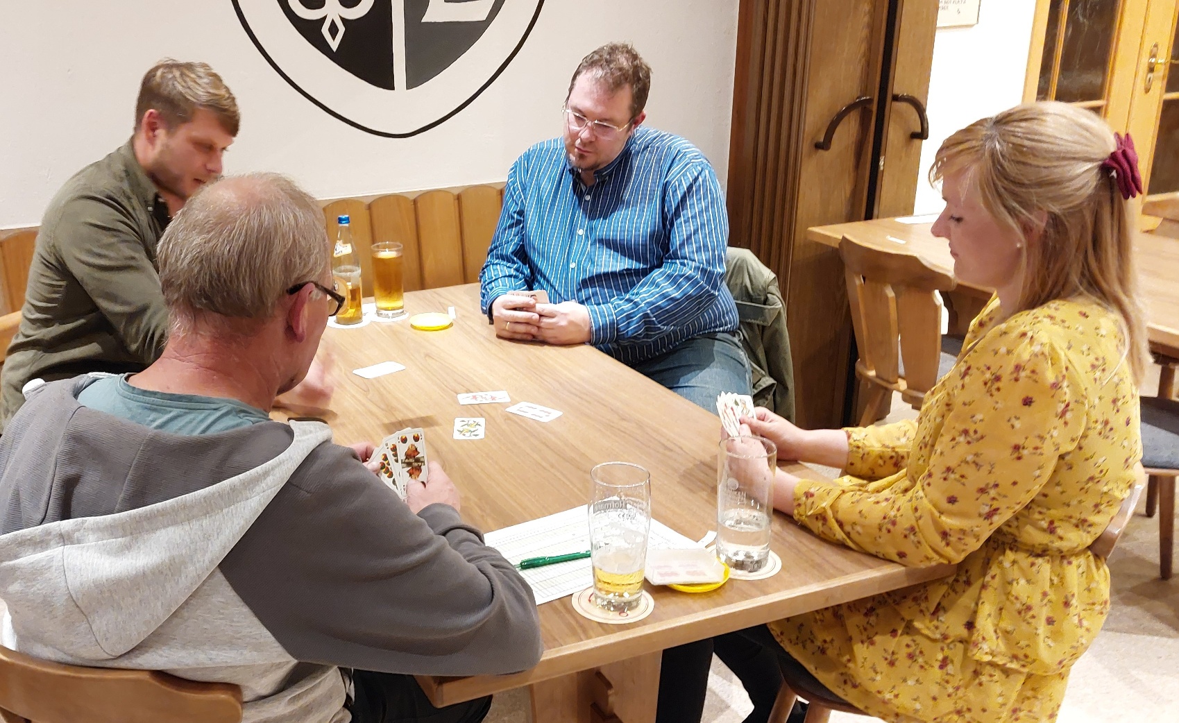 Als sie eintrafen war schon alles vorbereitet und auf allen Tischen standen neue Kartenspiele, Regeln und sogar Schüsseln für das Spielgeld bereit. Michl Jakob begrüßte und ergänzte noch einige Details, bevor es mit der Auslosung anfing. Schnell hatten sich die Vierergruppen gebildet und mehr oder weniger schnell wurden die ersten 32 Spiele für alle absolviert. Bei Halbzeit hatte sich bereits der spätere Sieger, Stefan Hasselmeyer, mit satten 90 Pluspunkten an die Spitze gesetzt. Auf den Plätzen Jan Wagner +55 und Andreas Busswell/Tobias Pfann mit +35 . Dann wurde neu gelost und es ging in die zweiten 32 Spiele. Danach war klar, dass Stefan mit noch einmal + 60 so was wie einen Vereinsrekord aufgestellt hat! 150 Pluspunkte wurden meines Wissens in den Jahren vorher nie erreicht. Auf den Plätzen folgte dann Andreas Busswell der mit erneut +25 auf gute 60 Pluspunkte kam. Platz drei teilten sich Gerhard Tiefel +18 und + 37 = +55 und Dieter Rupprecht + 13 und +42 = 55. Jan fing in Runde 2 – 22 Punkte ein und fiel auf Platz zurück. So erging es dem ein oder anderen. Mir bliebt mit -3 und + 17 gerade noch ein Platz in den top ten. Besonders spannend ist immer, wer sich den Presssack für den vorletzten Platz holt. Dieses Mal muss er geteilt werden weil mit Klaus Schneider und Matthias Marschig gleich zwei Bewerber bei – 55 gelandet waren. Der ungenannte Verlierer des Abends erzielte – 70.