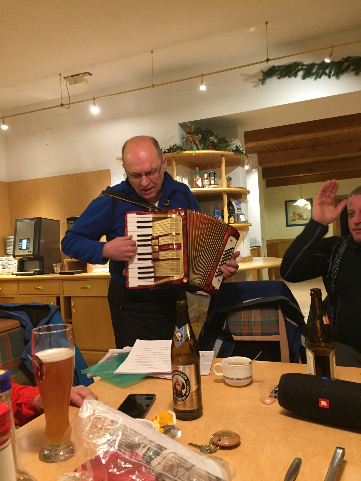 Zurück in der Unterkunft freute man sich auf das Abendessen, die Gastgeber haben sich sehr ins Zeug gelegt und servierten eine Grillplatte mit Steaks vom feinsten, dazu gab es Salatbüffet und Kroketten. Doch damit nicht genug, der krönende Abschluss war der Nachtisch: Tirami Su, Apfel- und Topfenstrudel mit Vanillesoße und Schlagsahne. Ein Genuss! Das Abendprogramm war bunt gemischt: Es wurde gesungen, getanzt, gelacht und gespielt. Dabei stieß man natürlich mit dem ein oder anderen Kurzen auf einen gelungenen Tag an.