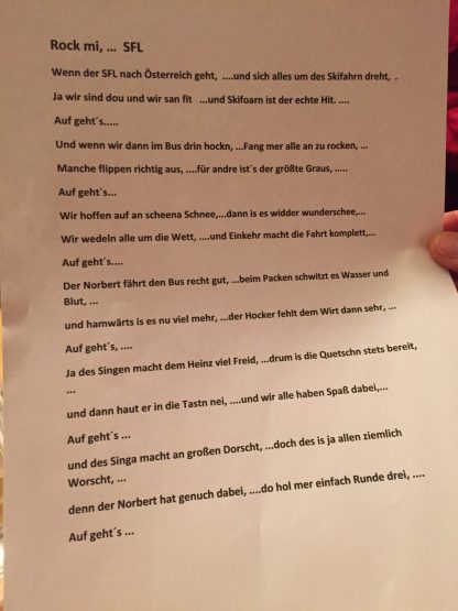 Frühstück ab 7.30 Uhr, Abfahrt zur Gondelstation um 8.45 Uhr. Ohne Verluste nach der langen Nacht brachte der Bus die SFL-Truppe nach Großarl. Bei Ankunft wurde gleich bemerkt, dass sich aus der kleinen Après-Ski-Bar an der Talstation eine ansehnliche Bar auf 2 Etagen entwickelt hat. Der Name ist wohl Programm: „RAMBAZAMBAR“. Die Menge ging ihrer Wege und genoss einen wunderschönen Skitag mit blauem Himmel, Sonne und besten Pistenverhältnissen. Das Skigebiet war nicht überfüllt, es gab kaum Wartezeit an den Liften – besser hätte es nicht sein können. Am späten Nachmittag – zwischen letzter Bergfahrt und Busfahrt zum Gästehaus lag noch genug Zeit für einen Besuch in der Bar – machte sich die Hälfte der Sportfreunde wieder auf den Weg in Quartier, während der Rest das Après Ski in vollen Zügen genoss. Die Rückkehrer wurden dann zu späterer Stunde mit Jubel und Applaus im Gästehaus begrüßt.
