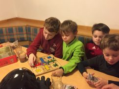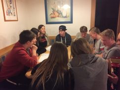 Nach einem Zwischenstopp sind wir gegen 20.30 Uhr im Gästehaus Gruber angekommen. Die Zimmereinteilung wurde bereits im Bus verkündet, damit war jedem klar, wo später eventuell noch die ein oder andere Party stattfand. Zügig wurden die Zimmer in Beschlag genommen, denn es wartete noch ein Abendessen auf uns. Nach Nudelsuppe, Schnitzel und Cordon Bleu saßen wir im Aufenthaltsraum noch zusammen und ließen den Abend ausklingen.