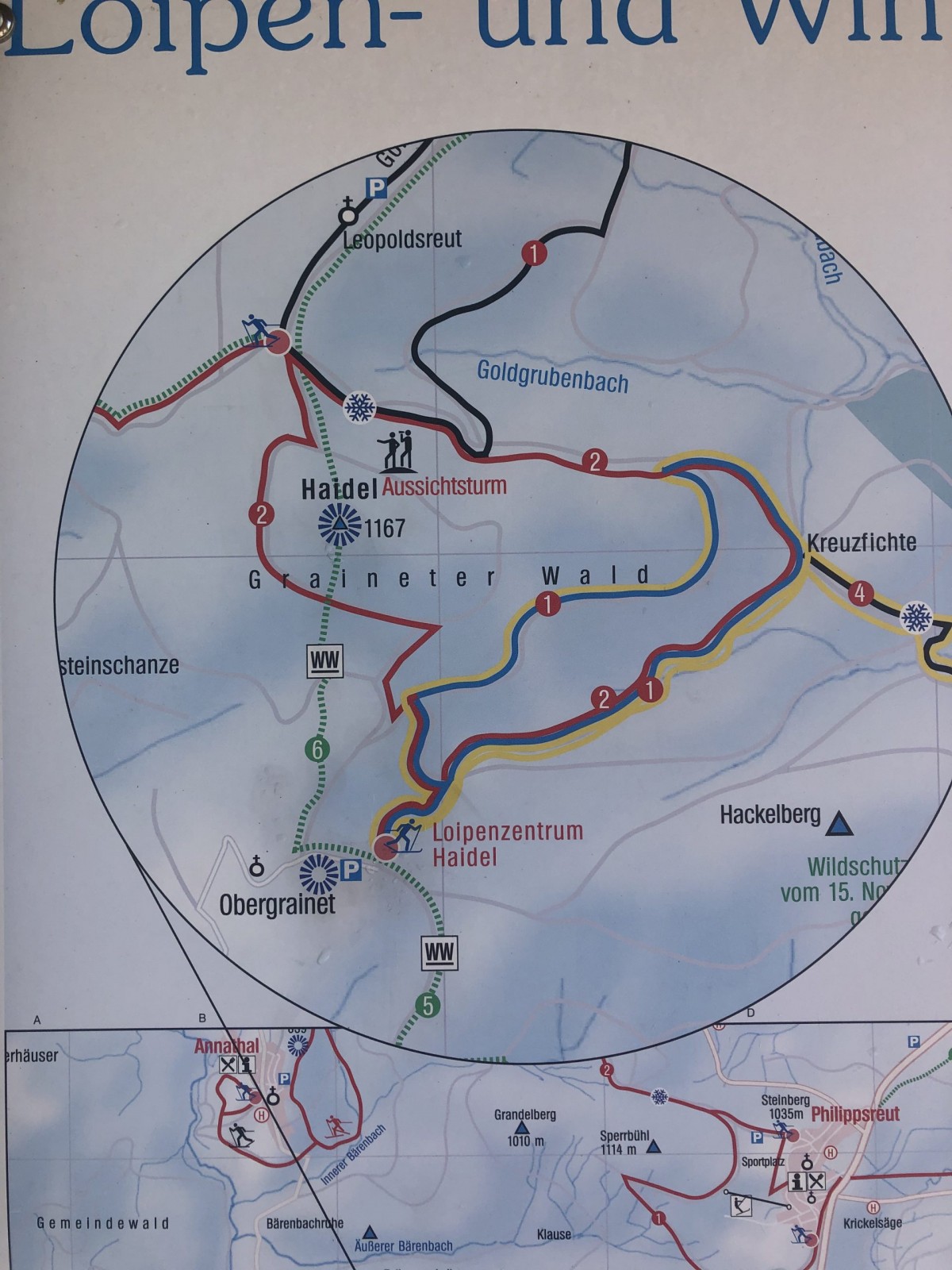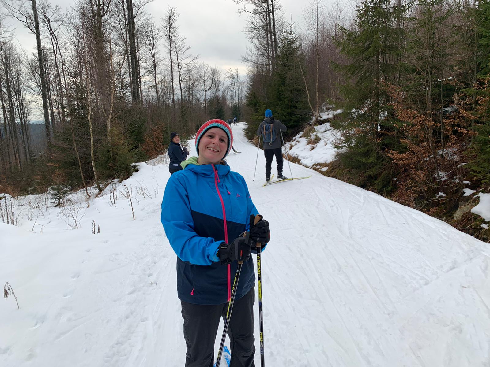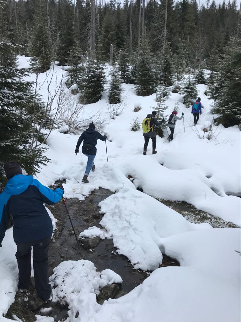 Am nächsten Tag war es dann leider wettertechnisch noch etwas komplizierter, denn es hatte in der Nacht geregnet und so haben wir uns in zwei Gruppen aufgeteilt. Die eine Gruppe zog es in den Graineter Wald um die Haidel-Loipe zu begehen und die andere Gruppe ging mit Wanderführer Hiltzi auf den Lusen. Der Chronist war beim Loipen-Team dabei, somit bekommt Ihr mehr Informationen über diesen Teil des Tages (die Bilder später sind aber von allen Aktivitäten). Die Grainet-Gruppe war, wie Fräulein Smilla auf der Suche nach Schnee. Das war nicht ganz so einfach, aber wir haben es tatsächlich geschafft und nach ca. 100 Metern waren wir dann auch auf unseren Brettern und konnten laufen. Es war aber extrem eisig und so hatten wir nach der ersten Abfahrt schon gleich zwei Stürze. Weiter ging es mit sehr verwirrender Beschilderung immer rund um den Heidel (1.165,6m) und manchmal ging es ganz gut aber leider sehr oft waren wir zu Fuß unterwegs, da es einfach nicht möglich war mit den Skiern zu laufen. Die Gruppe wurde erfinderisch und so wurden sogar Skitrage-Halterungen kreiert und so ausgerüstet zogen wir dann weiter. Nach einer längerem Fußmarsch waren wir dann wieder auf den Ski unterwegs, mussten dann aber leider wieder einen sehr schmerhaften Sturz hinnehmen.  Nach einer sehr langgezogenen Kurve ging es dann den „Postberg“ hinauf zum Haidel. Für die meisten ging es dann die restlichen 500 Meter noch nach oben zum Berggipfel und den Holzturm um die Aussicht zu genießen. Im Anschluss ging es dann zurück zum Auto und dann auf die Suche nach einer leckeren Stärkung.