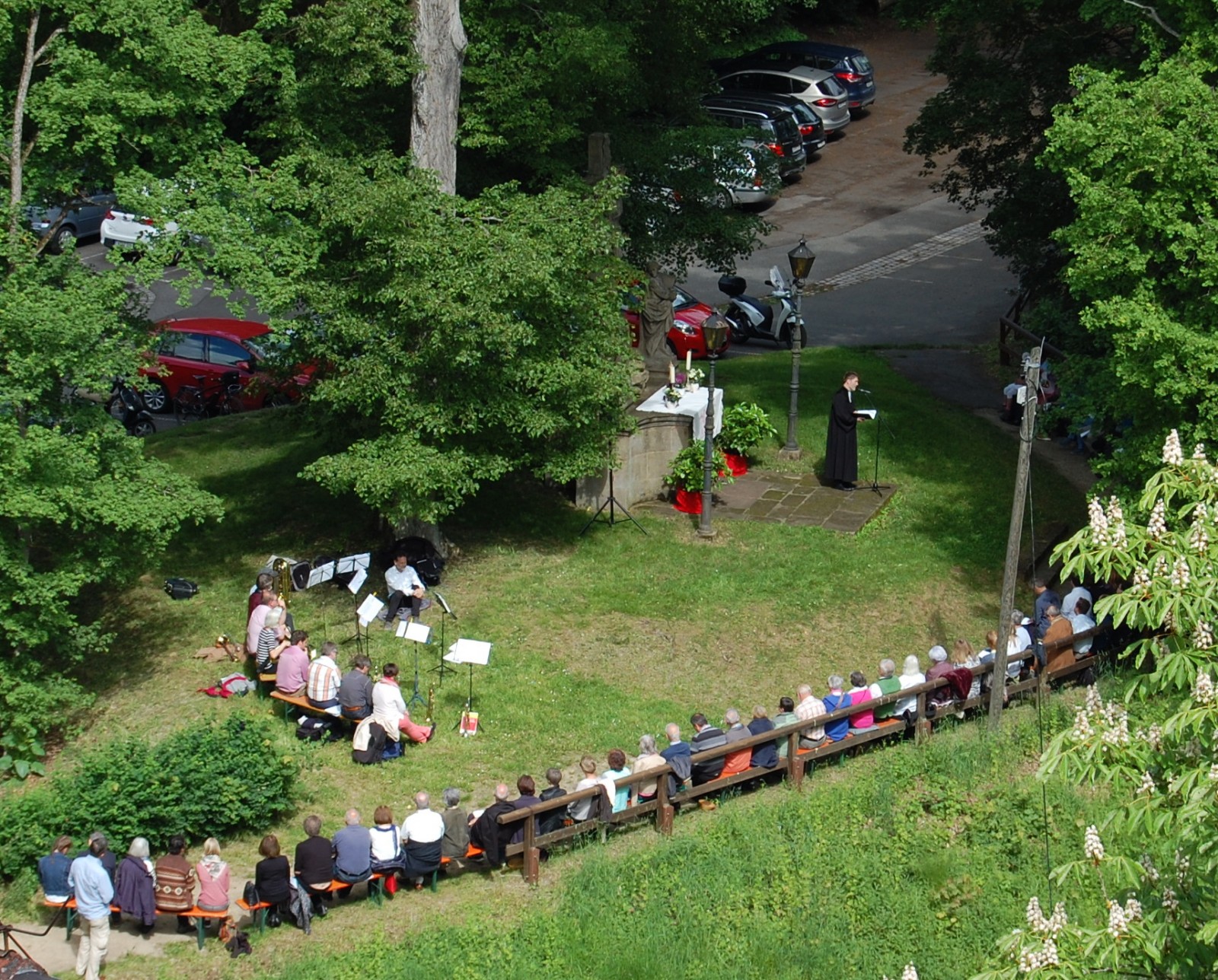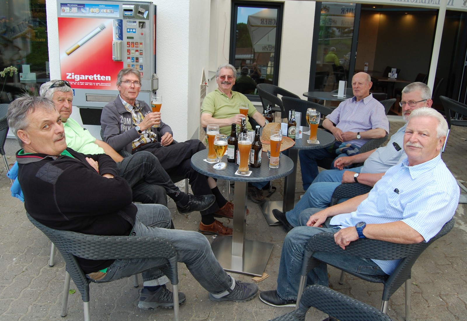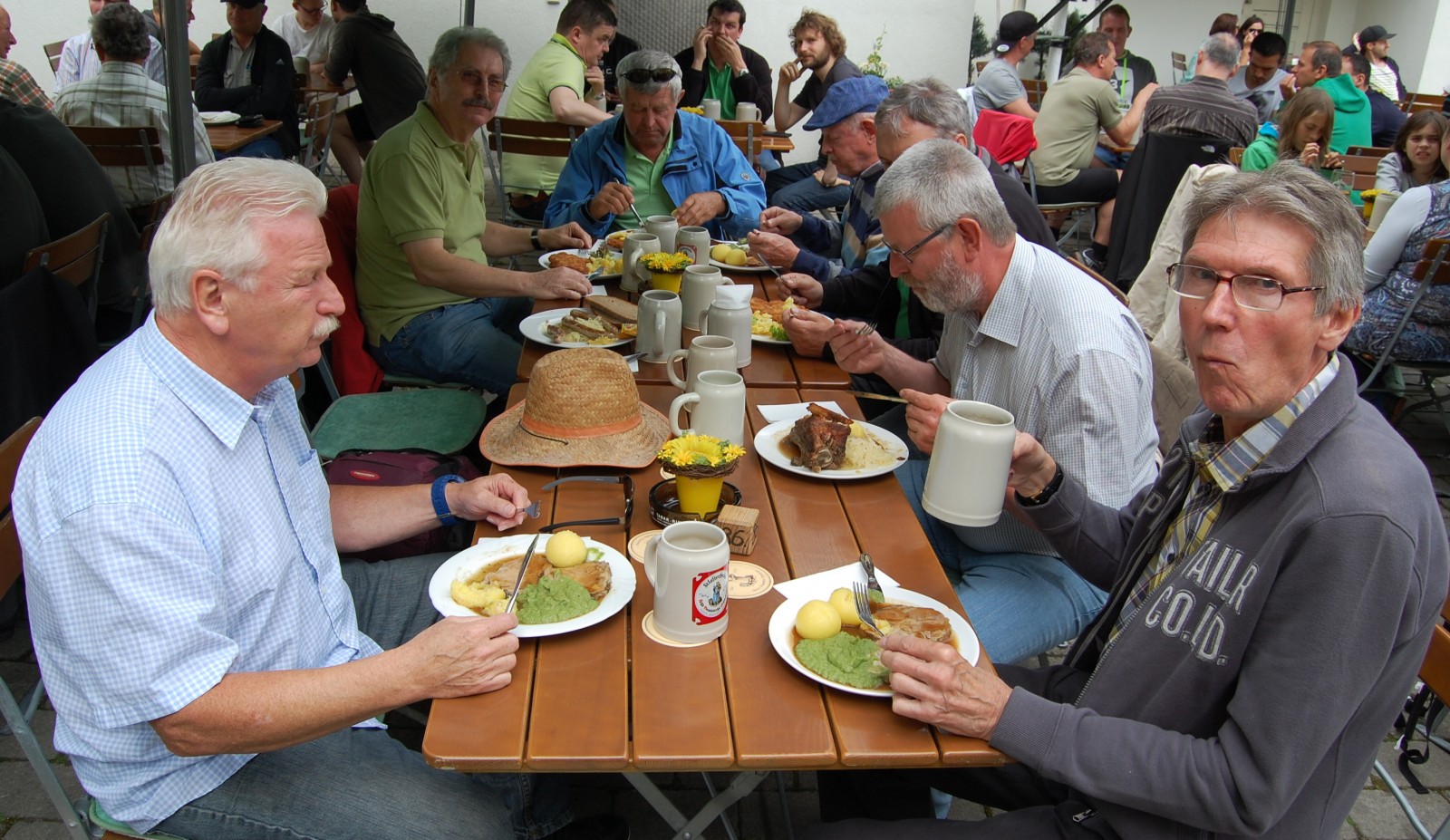 Nachdem die Rundfahrt uns wieder zum Domplatz zurückgebracht hatte, ging es per pedes hinein in die Altstadt, wo es ja entlang der Regnitz viele schöne Kneipen gibt. Auch hier hatte unser rühriger Günter vorgesorgt und in einem Biergarten reserviert. Während es mit dem „flüssigen Brot“ schnell ging, mussten wir auf das Essen lange warten. Dabei gab es ein Zusammentreffen mit Vatertagsausflüglern aus Meiersberg. So gestärkt ging es weiter, quer durch Bamberg, vorbei an vielen schönen Sehenswürdigkeiten. Noch einmal wurde Halt gemacht um sich für die letzten „Kilometer „ zum Bahnhof zu stärken. Dann war der Bahnhof erreicht und es ging bei sommerlichem Wetter auf gleichem Weg zurück nach Langenzenn. Dort sollte im Biergarten der Vatertag ausklingen, nachdem es aber Platzprobleme gab verlagerte man die letzte Einkehr des Tages ins neu eröffnete Hardhofcafe. Der Wirt war wohl mit dem Vatertagsgeschäft noch etwas überfordert, den „ ruck-zuck“ waren zumindest die Weizenvorräte aufgebraucht. Er darf jetzt ein Jahr lang üben, denn es kann gut sein, dass die Reisegruppe von „Porscha-Reisen“ in 2018 wieder vorbeischaut. Danke Günter für diesen schönen Ausflug.